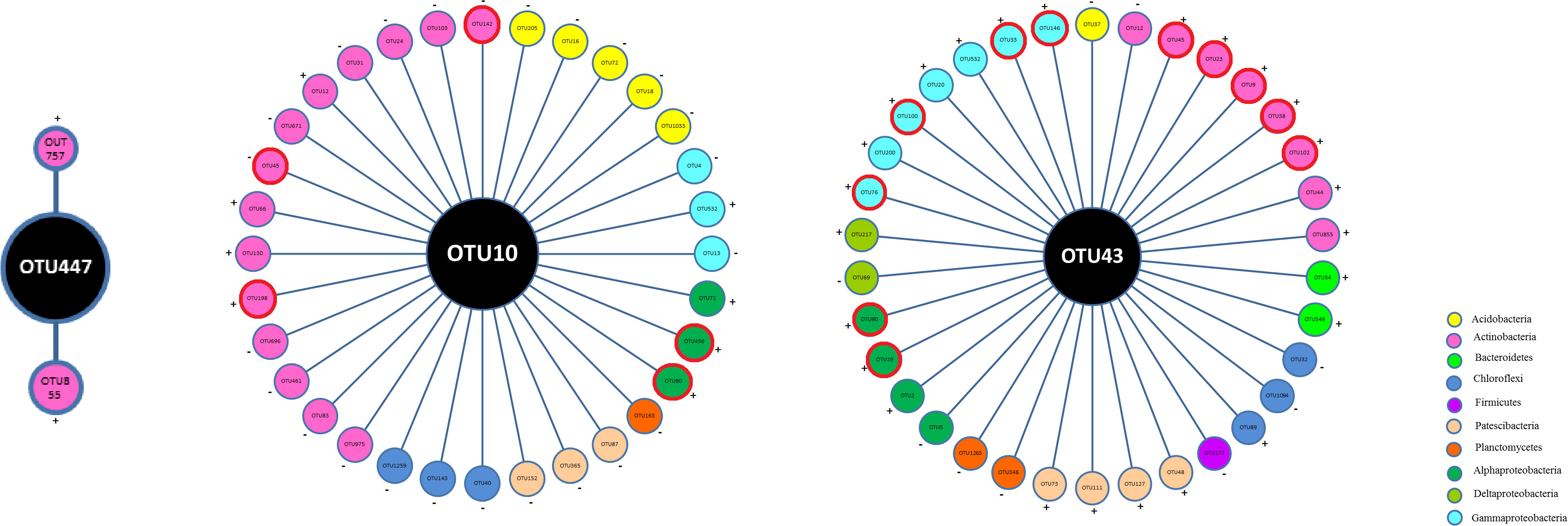 Among the co-occurrence associations for OTU10 in the S6–1 network, a total of 14 links (43.75%) could be accounted between OTU10 and the Actinobacterial taxa. A total of 5 links (15.63%) were observed between OTU10 and the Acidobacterial OTUs. The other associations could be accounted between OTU10 and the OTUs belonging to Chloroflexi (3 links), Patescibacteria (3 links), Planctomycetes (1 links), Gammaproteobacteria (3 links) and Alphaproteobacteria (3 links). Among the associations for OTU43 in the network UW4, a total of 8 links (23.53%) could be accounted between OTU43 and the Actinobacterial taxa, and 7 links (20.59%) could be observed between OTU43 and the OTUs belonging to Gammaproteobacteria. Some associations were observed between OTU43 and the OTUs belonging to Alphaproteobacteria (4 links), Patescibacteria (4 links), Chloroflexi (3 links), Bacteroidetes (2 links), Deltaproteobacteria (2 links), Planctomycetes (2 links), Acidobacteria (1 link), and Firmicutes (1 link). Further taxonomic annotation of the associated OTUs was provided in Supplementary Materials Supplementary Table S5.