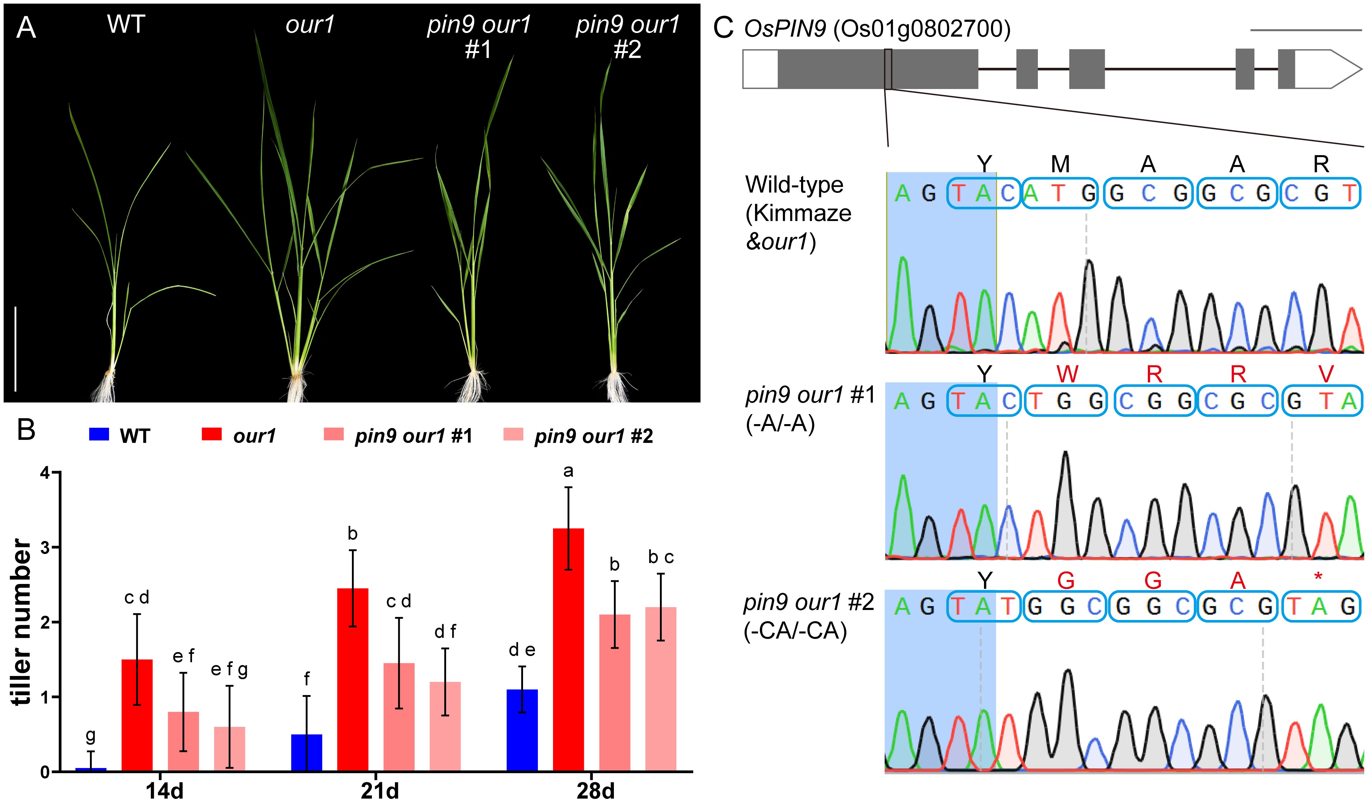 Figure 2. Tiller formation in the WT, our1 mutant, and lines with different mutation of OsPIN9 in the our1 mutant. (A) WT, our1, and T1 pin9 our1 lines grown under +Nut conditions and imaged at 21DAS. Scale bar = 10 cm. (B) Tiller numbers of WT, our1, and T1 pin9 our1 lines counted at the 14, 21, 28 DAS under +Nut conditions. Bars show mean ± SD (n = 20 plants per genotype per time point, T1 pin9 our1 #2, n = 5). Different lowercase letters denote significant differences among genotypes (two-way ANOVA followed by Tukey’s multiple-comparison test, P < 0.05). Error bars were truncated at zero because tiller counts cannot be negative. (C) Genotypes of T1 lines with different mutations of OsPIN9 in the our1 mutant background. Structure of the OsPIN9 gene (Os01g0802700). Gray and white boxes indicate exons and untranslated regions, respectively. Blue boxes display nucleotide triplets (codons), and the corresponding amino acids are shown above. Scale bars = 500 bp.