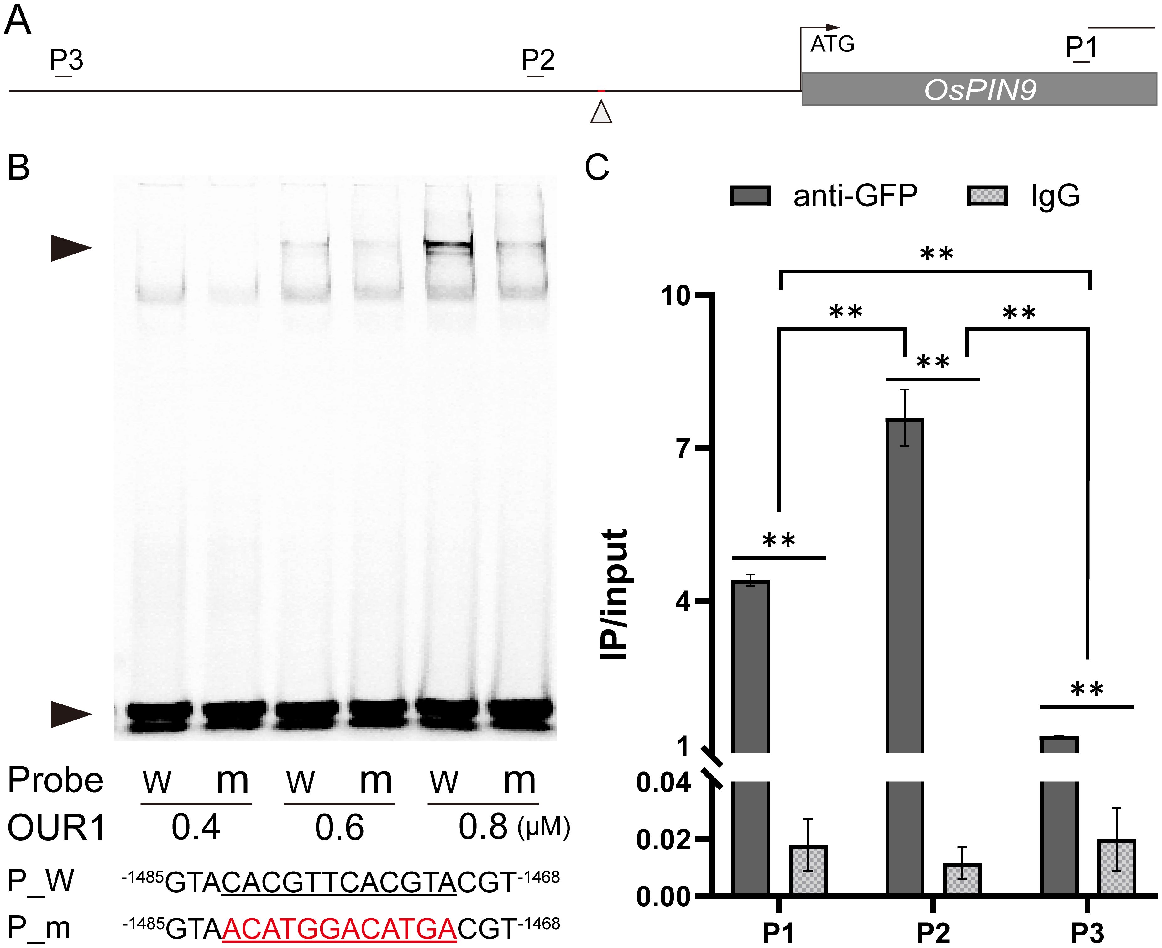 3.3 OUR1/OsbZIP1 binds to the OsPIN9 promoter region