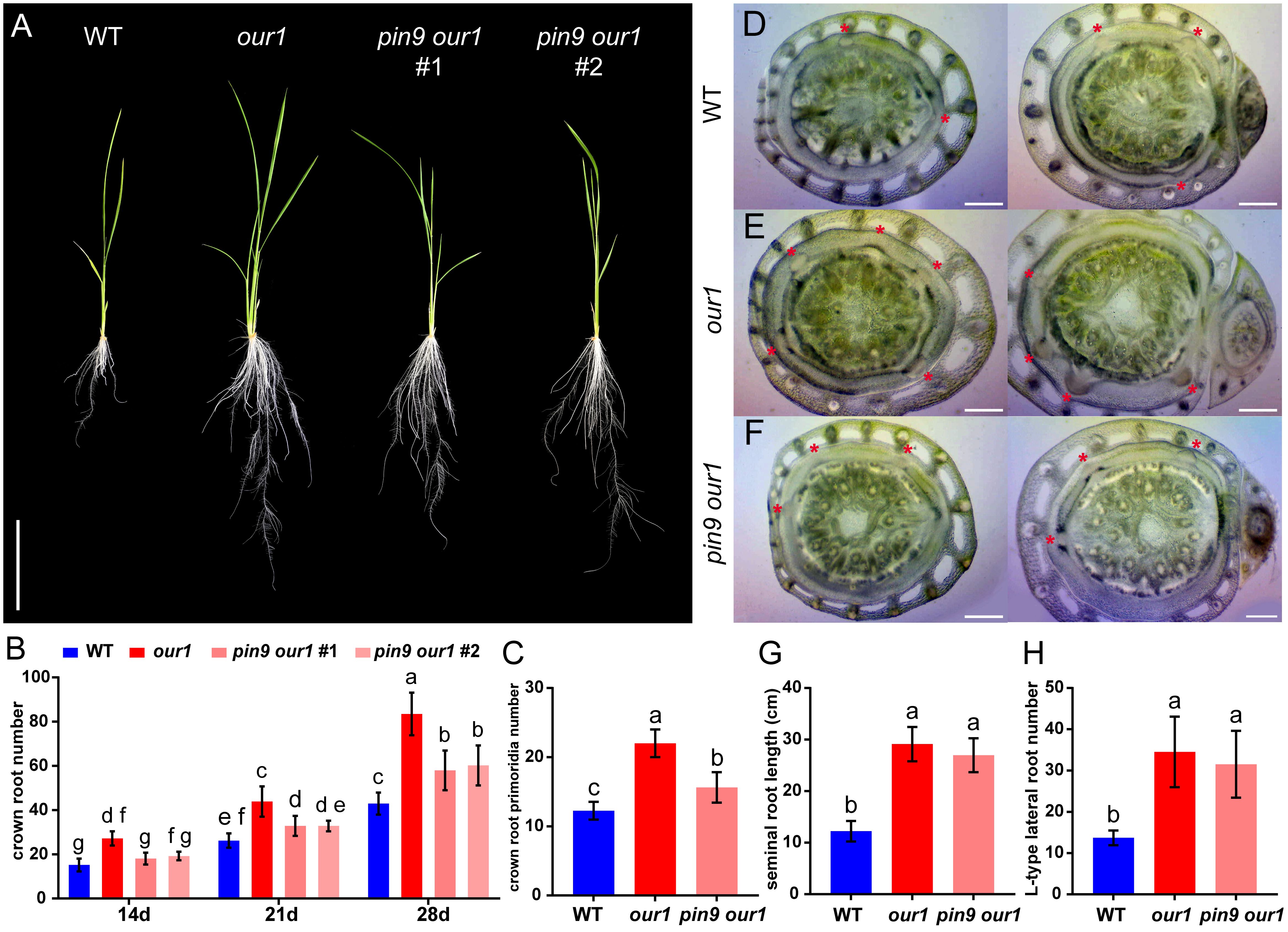 Figure 4. Upregulated OsPIN9 promotes CR formation in the our1 mutant. (A) 14-day-old seedlings of the WT, our1 mutant, and T1 pin9 our1 lines grown under +Nut condition. Scale bar = 10 cm. (B) Time course of emerged CRs in the WT, our1, and T1 pin9 our1 lines grown under +Nut conditions at 14, 21, and 28 DAS. (C) CRP number of 14-day-old WT, our1 mutant, and T1 pin9 our1 #1 grown under +Nut condition. (D-F) Cross sections of the stem base of the 14-day-old WT, our1, and T1 pin9 our1 double mutant #1 grown under +Nut conditions. Asterisks mark CRP. Scale bars = 0.5 mm. (G, H) seminal root length (G) and L-type lateral root number (H) of 14-day-old WT, our1, and T1 pin9 our1 #1 grown under +Nut condition. Data presentation, statistics, and sample sizes: Bars show mean ± SD. (B) Two-way ANOVA followed by Tukey’s multiple-comparison test. Different lowercase letters indicate significant differences among genotype–time groups (P < 0.05). (C, G, H) One-way ANOVA followed by Tukey’s multiple-comparison test; different lowercase letters indicate significant differences between genotypes (P < 0.05). Sample sizes: (B) n = 20 plants per genotype; T1 pin9 our1 #2, n = 5 (C) n = 8 per genotype; (G, H) n = 20 per genotype.