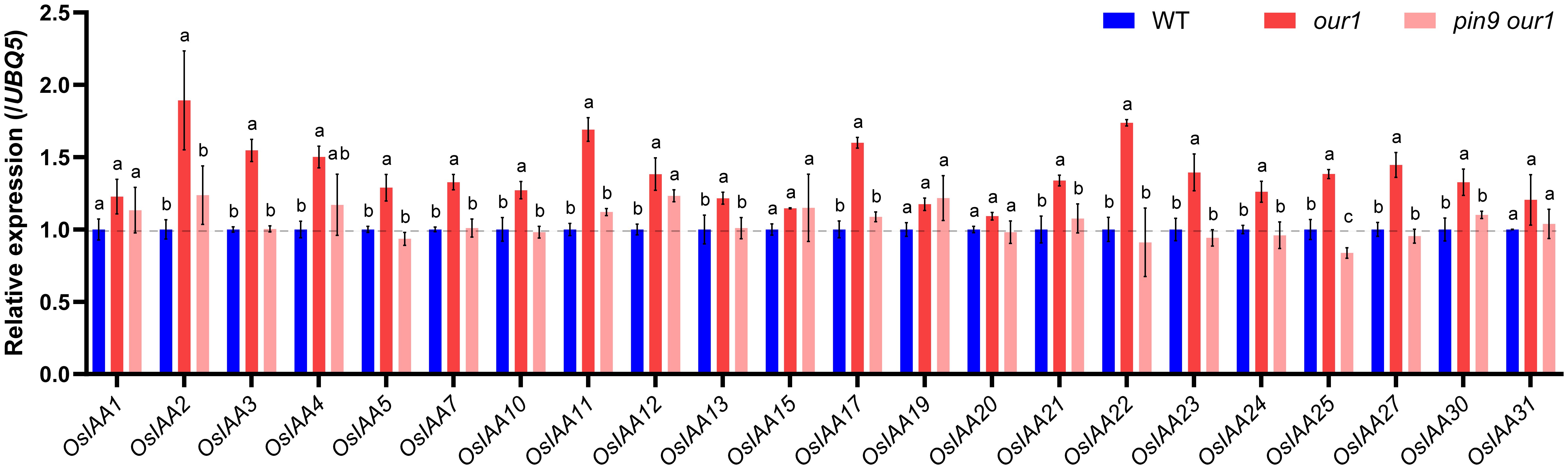 Figure 5. Expression of AUX/IAA genes at the stem base. Relative expression of 22 AUX/IAA genes at the stem base of the WT, our1, and T1 pin9 our1 #1 seedlings. Expression values were normalized to UBQ5 (WT set to 1). Bars represent the mean ± SD (n = 3 biological replicates). For each gene, different lowercase letters indicate significant differences among genotypes (one-way ANOVA within genes, followed by Tukey’s multiple comparison test, P < 0.05). The primer sequences are listed in Supplementary Table 1.