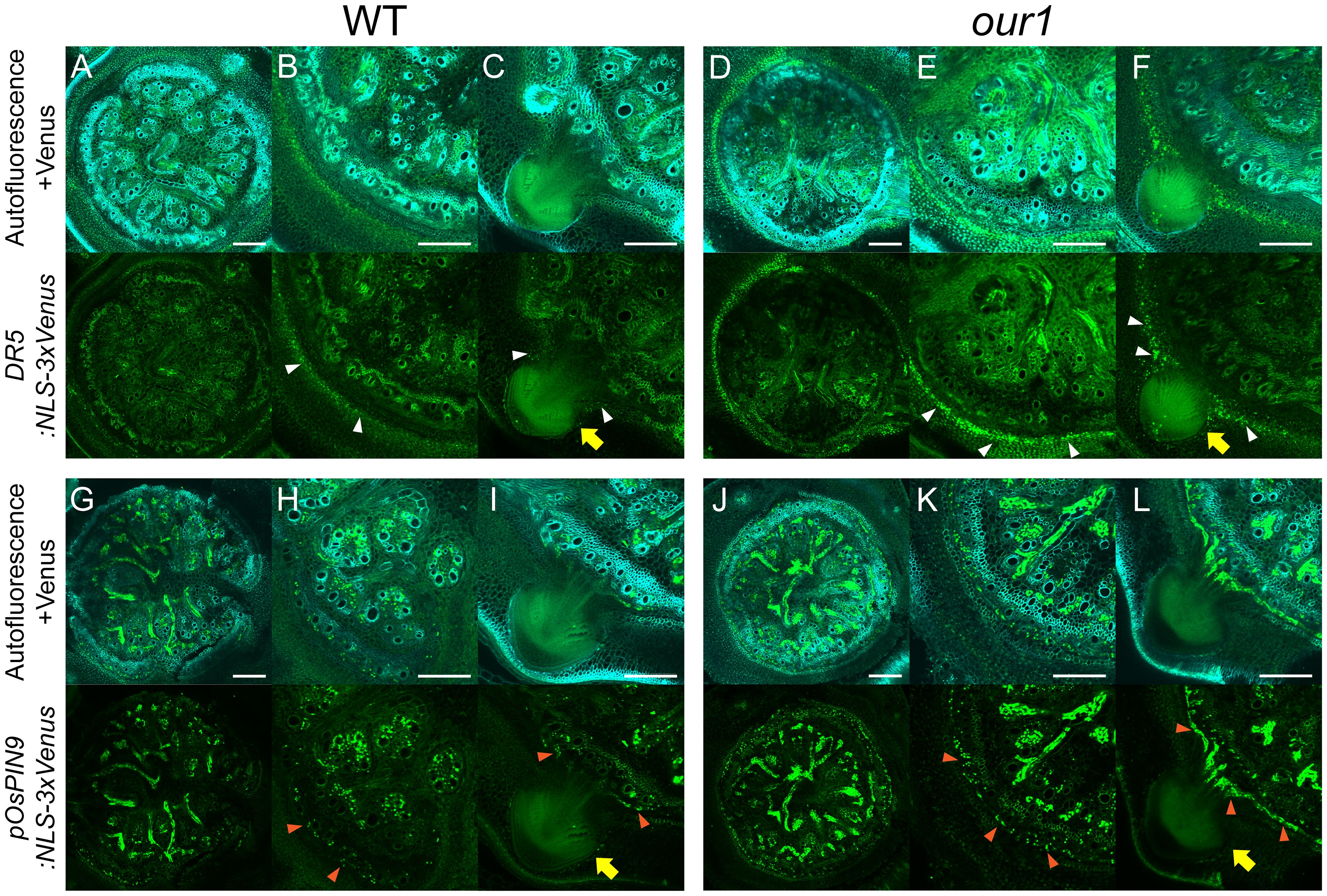 Figure 6. Patterns of auxin signaling and OsPIN9 expression at the stem base. (A–F) Distribution of auxin signaling under +Nut conditions. Cross-sections expressing the DR5:NLS-3×Venus reporter are shown for WT (A–C) and our1 (D–F). Close-up views showing regions without (B, E) and with CRP (C, F). Venus fluorescence (green dots) denotes the DR5-driven auxin response, and autofluorescence is visible in the background. White arrowheads indicate localized auxin signaling, and yellow arrows indicate CRP. Scale bars = 200 µm. (G–L) Spatial pattern of OsPIN9 promoter activity under +Nut conditions. Cross-sections expressing the pOsPIN9:NLS-3×Venus reporter are shown for WT (G–I) and our1 (J–L). Close-up views show regions without CRP (H, K) or CRP (I, L). Venus fluorescence (green dots) denotes pOsPIN9-driven signal, and autofluorescence is visible in the background. Orange arrowheads indicate localized OsPIN9 expression and yellow arrows indicate CRP expression. Scale bars = 200 µm.