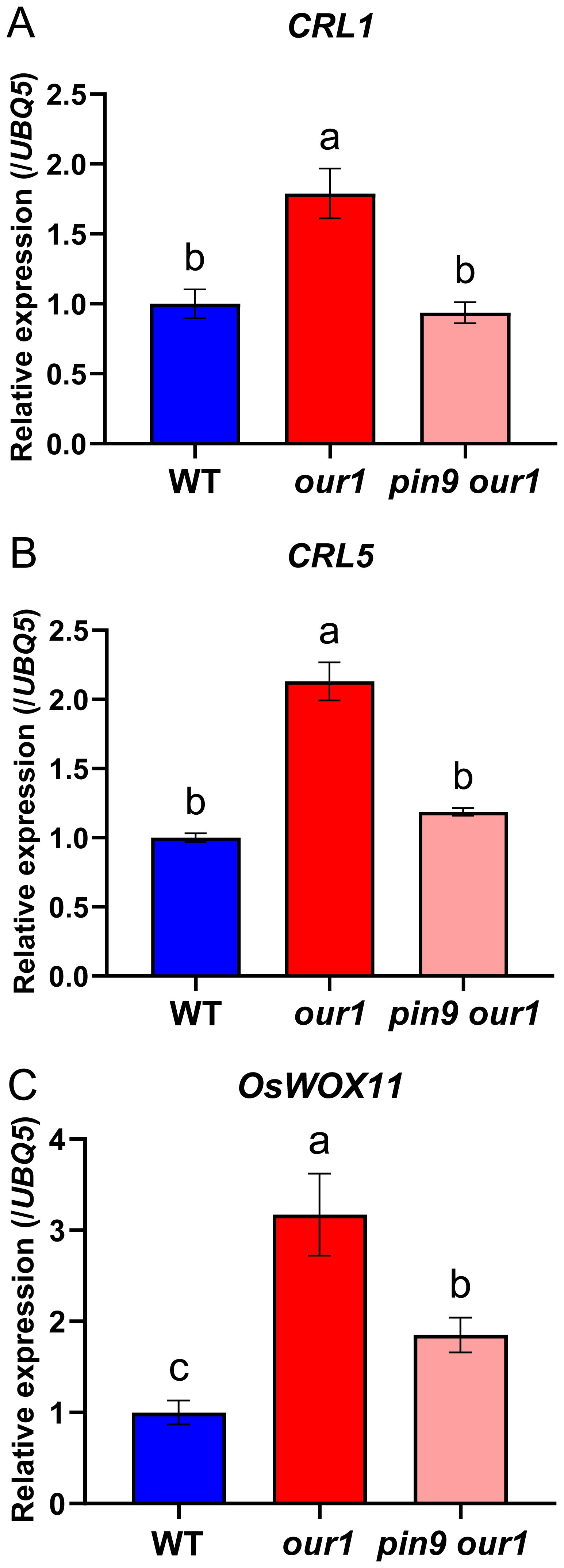 Figure 7. Auxin-responsive CR regulators are upregulated at the stem base in the our1 mutant and depend on OsPIN9. (A–C) Relative expression levels of CRL1 (A), CRL5 (B), and OsWOX11 (C) at the stem base in the WT, our1, and T1 pin9 our1 double mutant #1 seedlings under +Nut conditions for 14d. Expression values were normalized to UBQ5 (WT set to 1). Bars show mean ± SD (n = 3 technical replicates, repeated with two biological replicates with similar results). Different lowercase letters denote significant differences (one-way ANOVA with Tukey’s multiple-comparison test, P < 0.05). Primer sequences are listed in Supplementary Table 1.