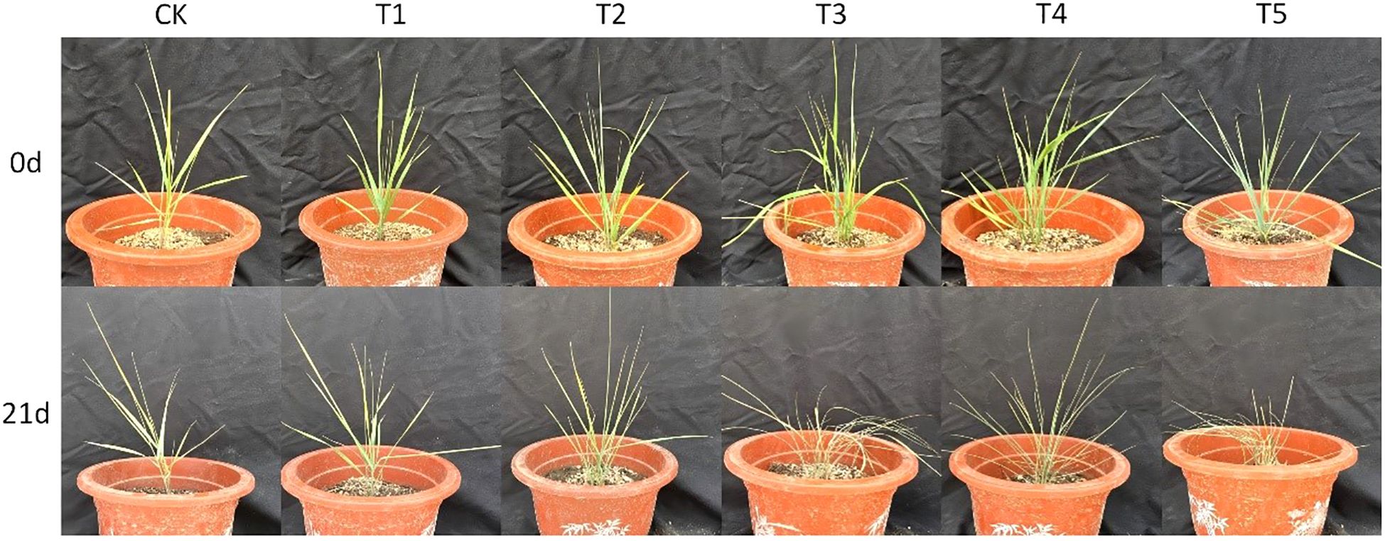 Studies have shown that the suitable concentration range of SA varies among different types of gramineous plants due to different planting methods or stress levels (Korgaonker and Bhandari, 2023; Shemi et al., 2021; Bagautdinova et al., 2022), but most of them are concentrated between 0.05 mmol/L and 2.5 mmol/L. As a signaling molecule, the effect of SA may follow the typical “low concentration promotes, high concentration inhibits” effect (Li et al., 2022). To capture the turning point of high concentration during the experiment and make the design more complete, six SA concentrations were set, namely: Control check, 0 mmol/L (CK), Treatment 1, 0.25 mmol/L (T1), Treatment 2, 0.50 mmol/L (T2), Treatment 3, 1.00 mmol/L (T3), Treatment 4, 2.00 mmol/L (T4), and Treatment 5, 4.00 mmol/L (T5).Starting on July 16, 2024, the SA solutions were sprayed onto the leaves each evening until the leaf surface was slightly covered with droplets but without runoff. Approximately 30 mL of solution was applied per pot, and spraying was conducted for three consecutive days. On July 19, drought stress was imposed on Leymus chinensis, and observations and measurements were carried out 21 days after the initiation of drought treatment. Each treatment was replicated six times, resulting in a total of 36 experimental units.