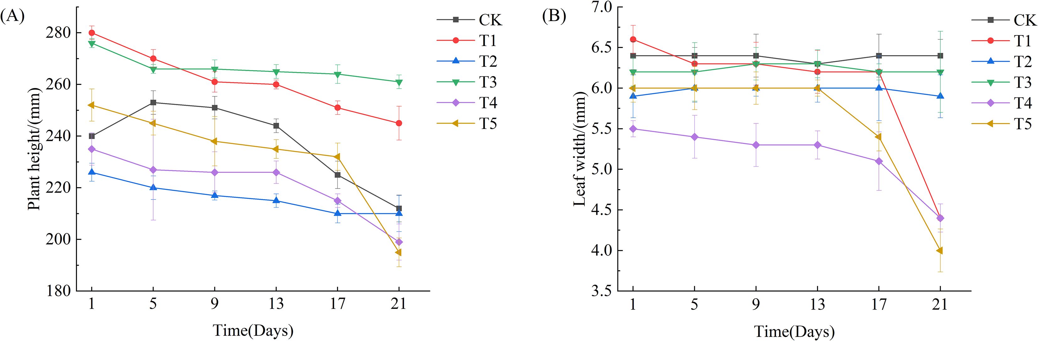 As shown in Figures 2 and 3, after 21 days of drought treatment, the plant height of Leymus chinensis seedlings in all five SA treatment groups decreased with increasing concentration. Notably, the reductions in plant height under T2 and T3 treatments were smaller than that of the control (CK), decreasing by only 0.06% and 0.05%, respectively, relative to CK. From day 13 of the treatment onward, leaf width in the T1, T4, and T5 groups began to decline, whereas no significant changes were observed in the T2 and T3 groups compared to CK throughout the entire stress period.