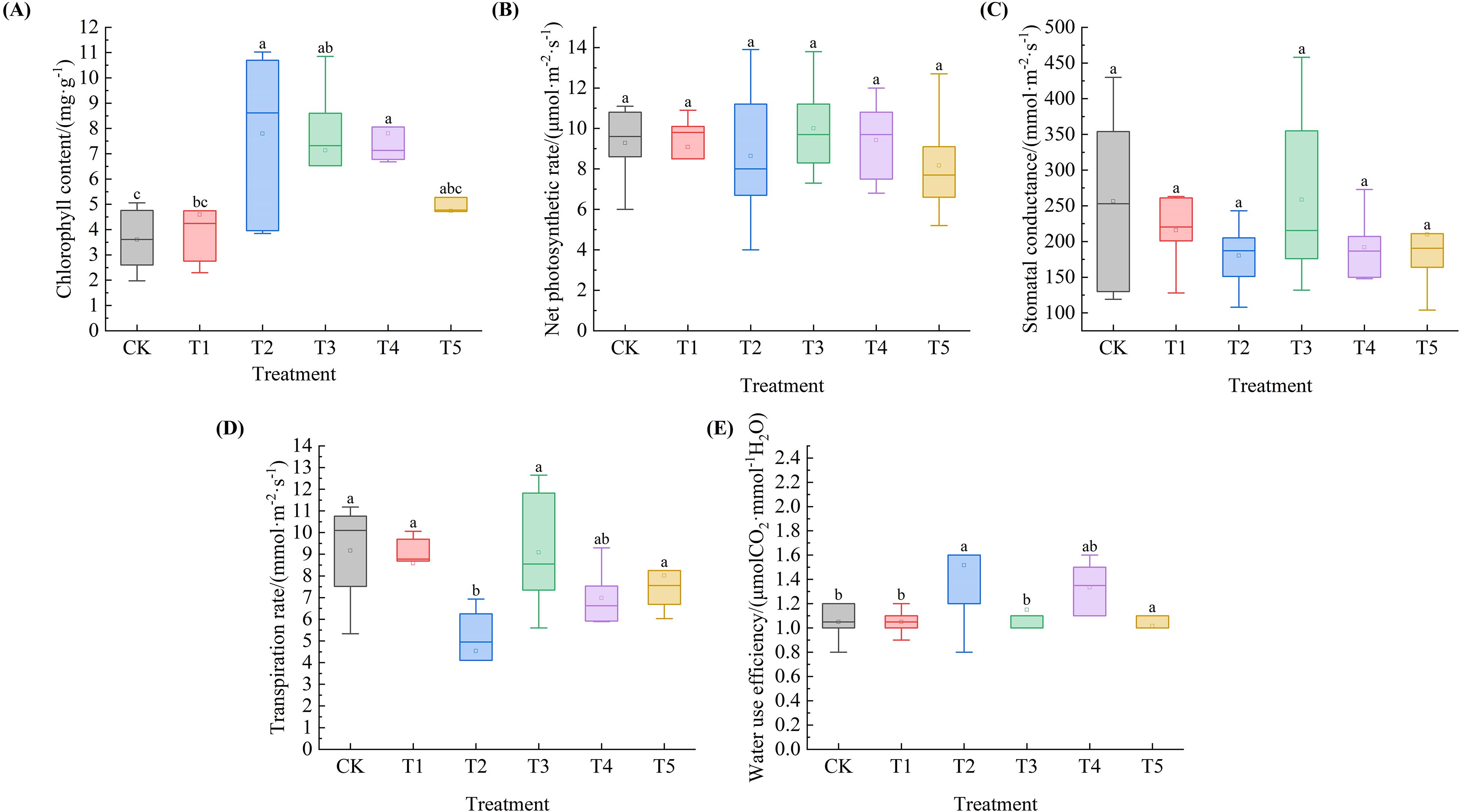 Photosynthetic parameters were measured using a fourth-generation CIRAS-4 portable photosynthesis system. The parameters measured included net photosynthetic rate (Pn), stomatal conductance (gs), transpiration rate (Tr), and water use efficiency (WUE).