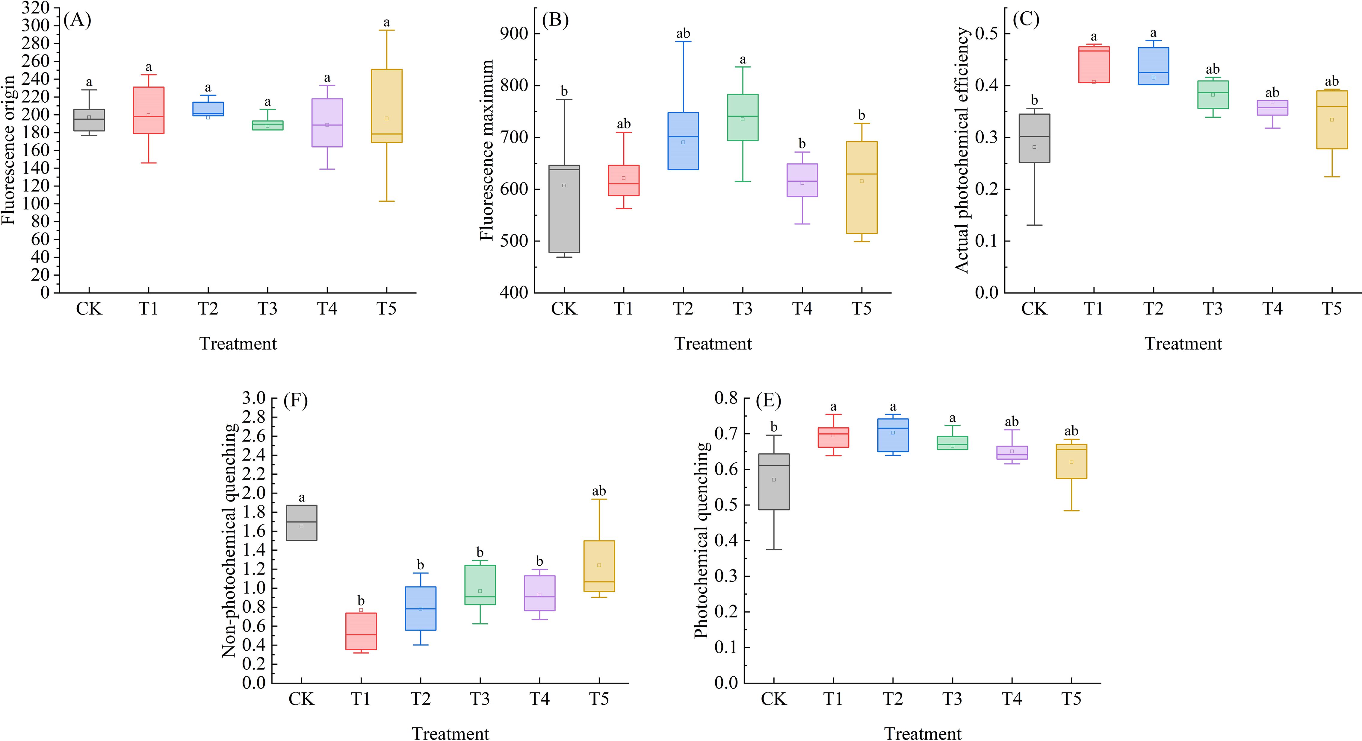 The fluorescence parameters were measured using the FMS2+ portable pulse-modulated fluorometer. The indicators measured included: initial fluorescence (Fo), maximum fluorescence (Fm), actual photochemical efficiency (ΦPSII), photochemical quenching coefficient (qP), and non-photochemical quenching coefficient (NPQ).