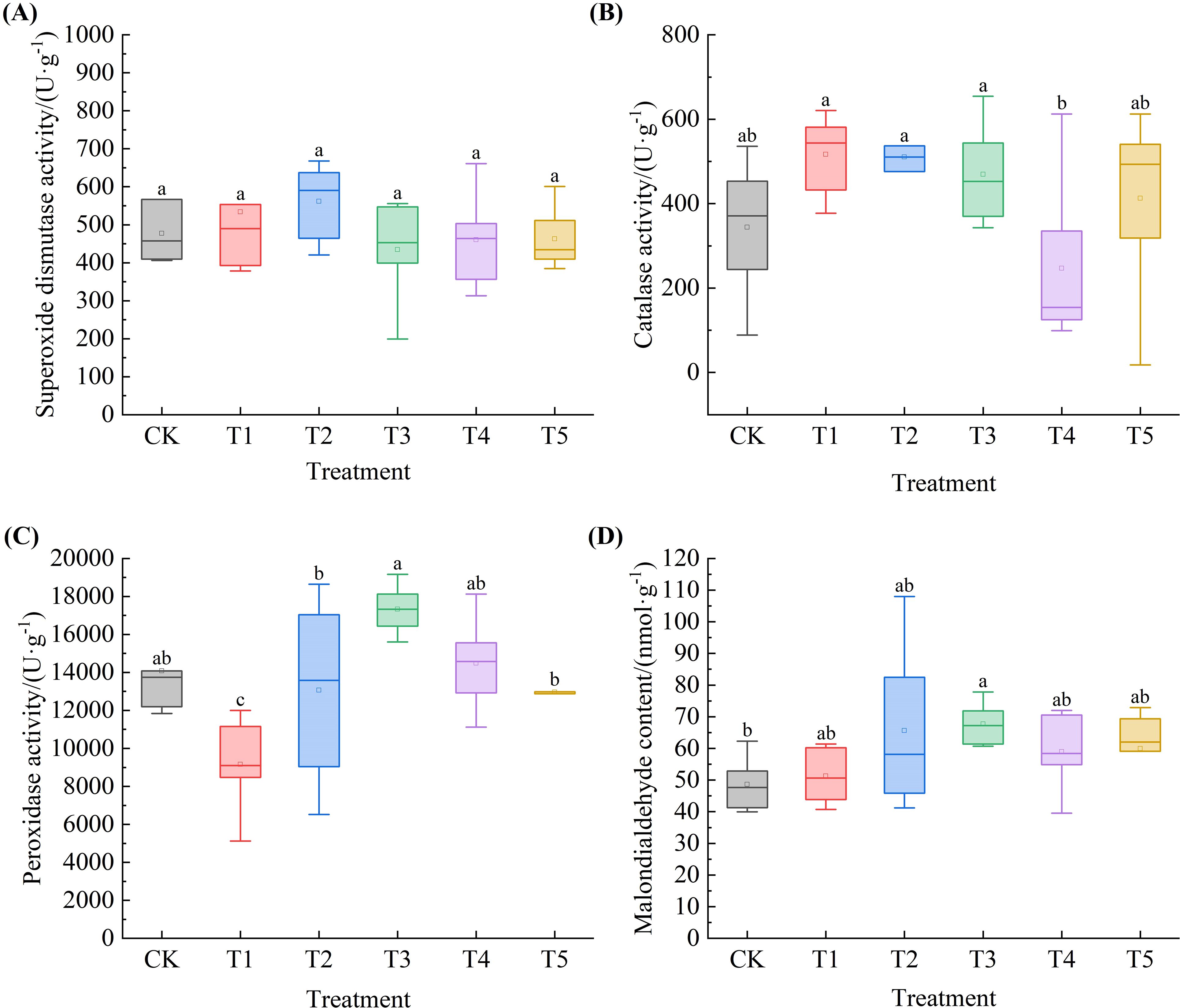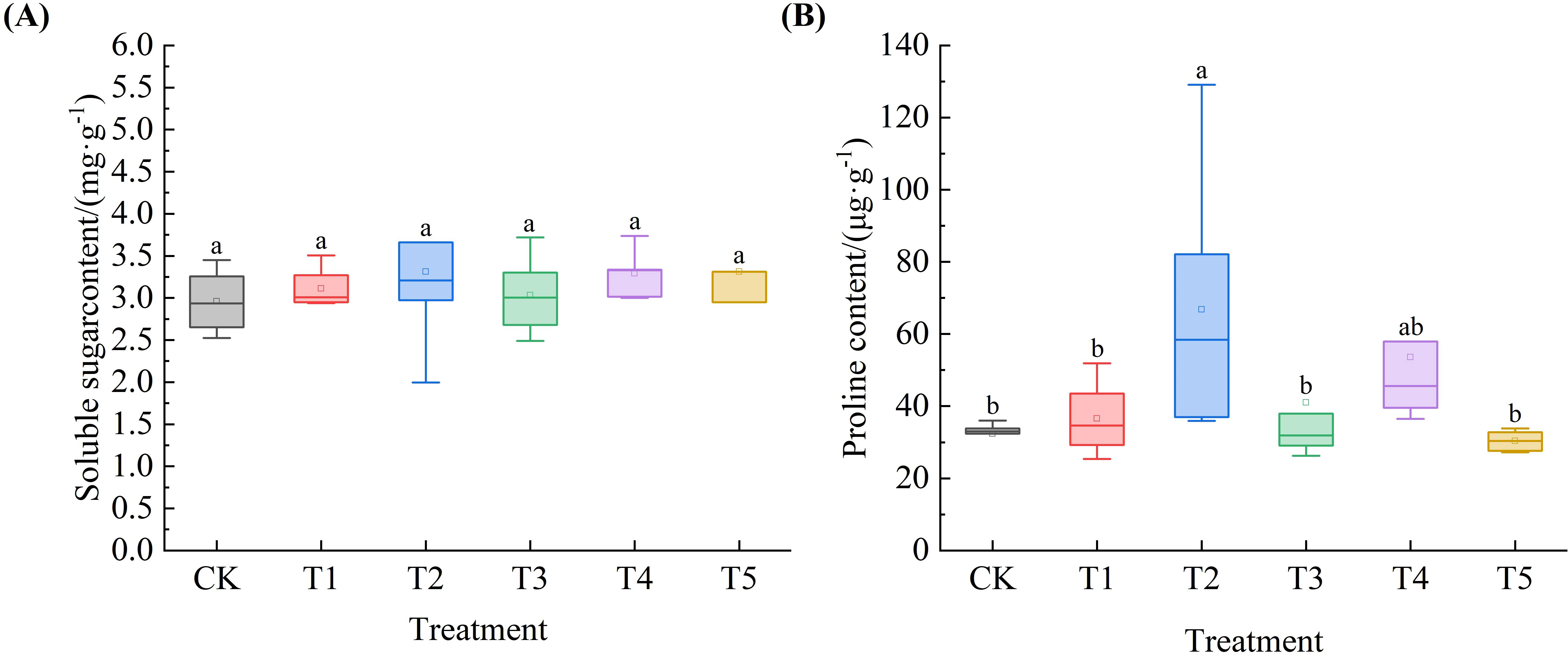 The contents of soluble sugar (SS), proline (Pro), and malondialdehyde (MDA), as well as the activities of superoxide dismutase (SOD), catalase (CAT), and peroxidase (POD), were determined using assay kits purchased from Beijing Boxi Shenggong Technology Co., Ltd.