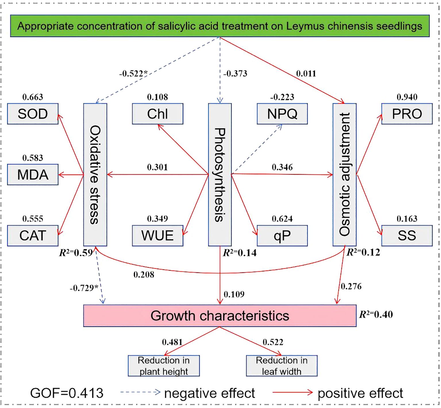 Figure 10. Structural equation model of exogenous salicylic acid (SA) regulating the growth and morphological structure of Leymus chinensis. Red solid arrows indicate positive effects, and blue dashed arrows indicate negative effects (*P < 0.05). GOF represents the goodness of fit of the structural equation model, and R2 represents the percentage of variance of the dependent variable explained by the model.