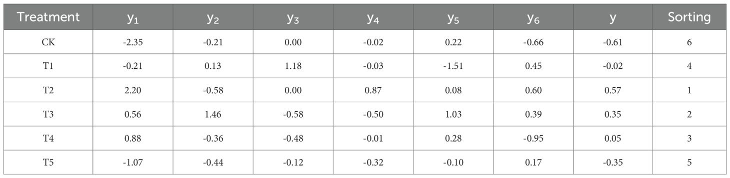 The comprehensive evaluation scores for the six SA treatments were calculated. A higher y value indicates better drought resistance performance, with the ranking order as T2 > T3 > T4 > T1 > T5 > CK. According to Tables 1 and 2, the comprehensive performance scores of the control group (CK) and the T1 (0.25 mmol/L) and T5 (4.00 mmol/L) treatments were all negative, indicating that under extreme drought conditions, the growth and development of Leymus chinensis were significantly impaired, and both excessively low and high SA concentrations compromised the effectiveness of the drought resistance enhancement. The highest comprehensive score was observed under T2 (0.50 mmol/L) treatment, followed by T3 and T4. These results suggest that application of 0.50, 1.00, and 2.00 mmol/L SA solutions can effectively improve the drought tolerance of Leymus chinensis under extreme drought stress, with 0.50 mmol/L exhibiting the most pronounced effect and thus significantly enhancing the plant’s adaptability to adverse climatic conditions.