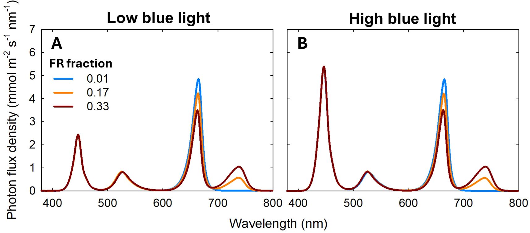 Spectral graphs comparing photon flux density against wavelength for low and high blue light. Graph A shows data for low blue light, and Graph B for high blue light. Each graph displays three lines representing far-red (FR) fractions of 0.01, 0.17, and 0.33, colored blue, orange, and brown respectively. Peaks are prominent around 450nm, 650nm, and 750nm across both graphs, demonstrating the variation in photon flux density across the spectrum.