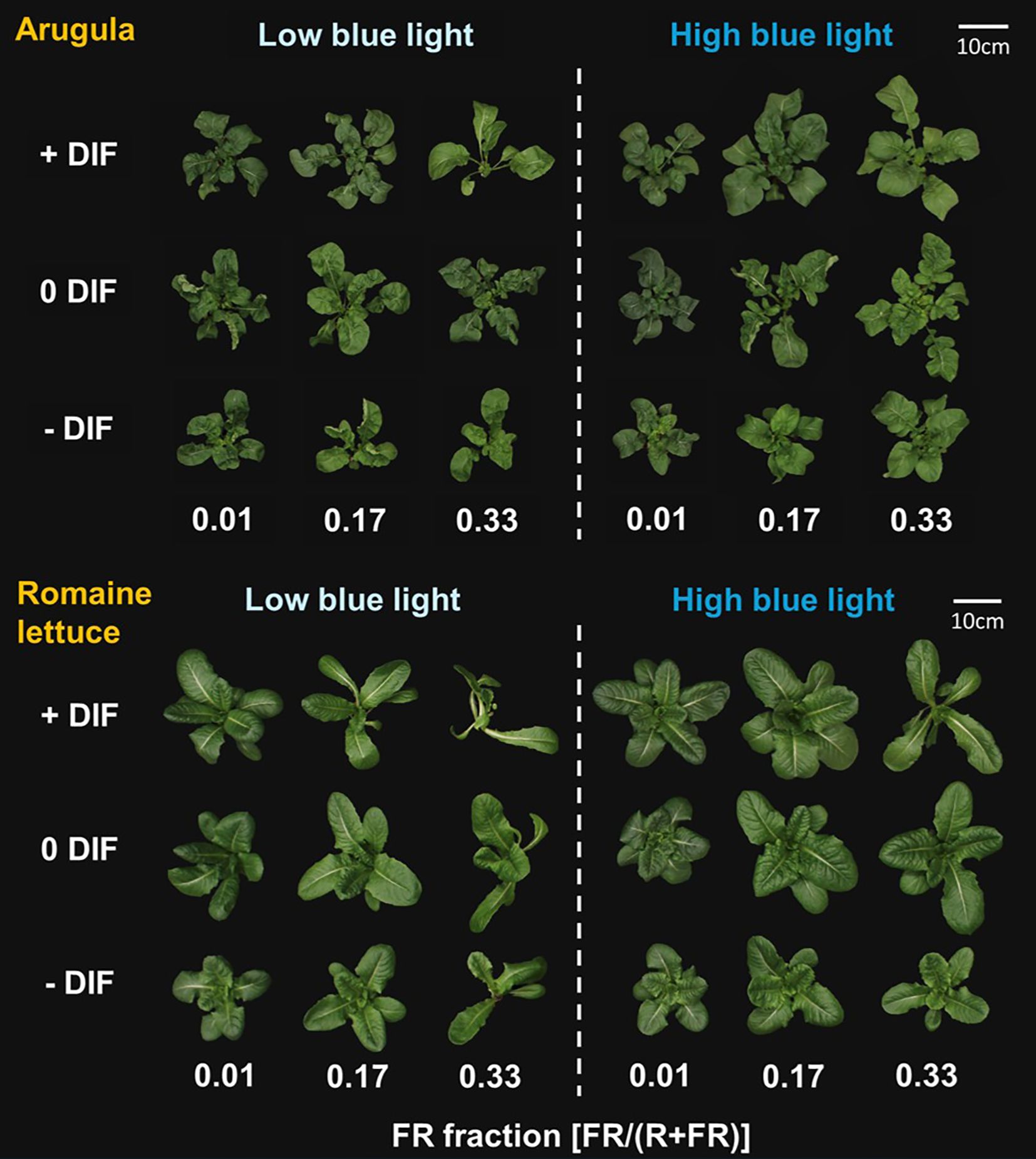 Arugula and Romaine lettuce are shown under varying blue light conditions, differentiated by FR fraction values of 0.01, 0.17, and 0.33. Rows indicate treatment levels: +DIF, 0DIF, and -DIF. The left side displays low blue light, while the right side shows high blue light conditions. Each plant variation is depicted as organized by its growth response to the light and DIF treatments.