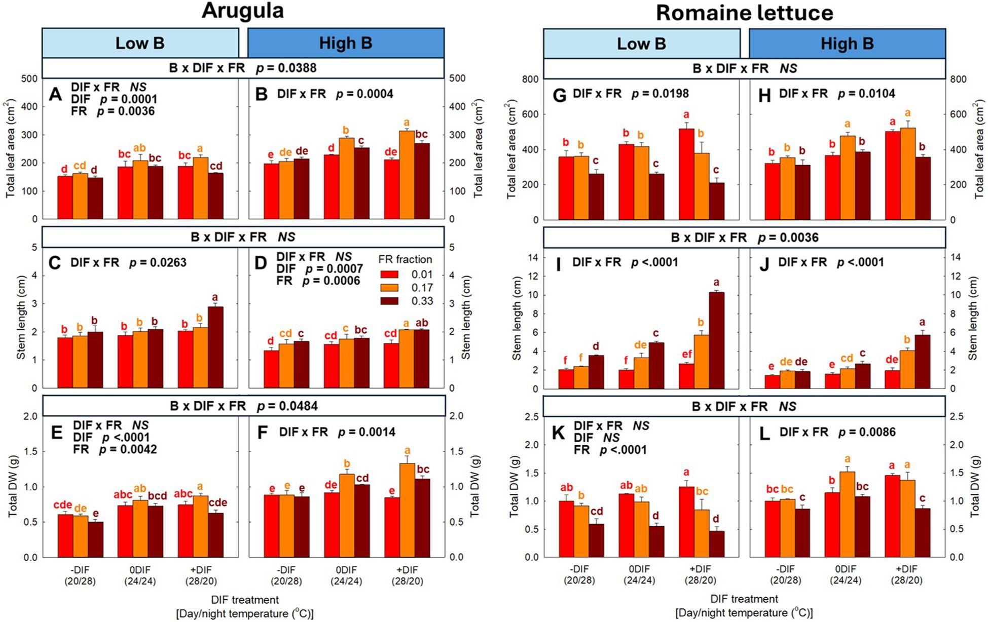 Figure 3. The interactive effect between light spectral quality [0.01, 0.17, and 0.33 of far-red (FR) fraction] and temperature [-DIF (difference between day and night temperature), 0DIF, +DIF] on total leaf area (A, B), stem length (C, D) and total DW (E, F) of arugula and total leaf area (G, H), stem length (I, J) and total DW (K, L) of romaine lettuce under low and high blue light conditions. Three-way ANOVA was conducted to assess the interactive effects among FR fraction, DIF, and blue light. To further evaluate the interactions between FR light and DIF under different blue light intensities, two-way ANOVA was performed for FR fraction and DIF within each blue light level. Different letters above the mean ± SE [n = 3; subsamples (4 plants per treatment per replicate study) were averaged before statistical analysis] indicate significant difference among the nine treatments (three FR fractions x three DIF treatments) at p < 0.05. NS stands for non-significance.