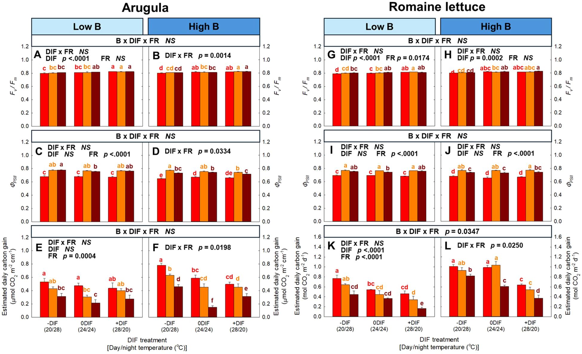 Figure 4. The interactive effect between light spectral quality [0.01, 0.17, and 0.33 of far-red (FR) fraction] and temperature [-DIF (difference between day and night temperature), 0DIF, +DIF] on Fv/Fm (A, B), ΦPSII (C, D) and estimated daily carbon gain (E, F) of arugula and Fv/Fm (G, H), ΦPSII (I, J) and estimated daily carbon gain (K, L) of romaine lettuce under low and high blue light conditions. Three-way ANOVA was conducted to assess the interactive effects among FR fraction, DIF, and blue light. To further evaluate the interactions between FR light and DIF under different blue light intensities, two-way ANOVA was performed for FR fraction and DIF within each blue light level. Different letters above the mean ± SE [n = 3; subsamples (4 plants per treatment per replicate study) were averaged before statistical analysis] indicate significant difference among the nine treatments (three FR fractions x three DIF treatments) at p < 0.05. NS stands for non-significance.