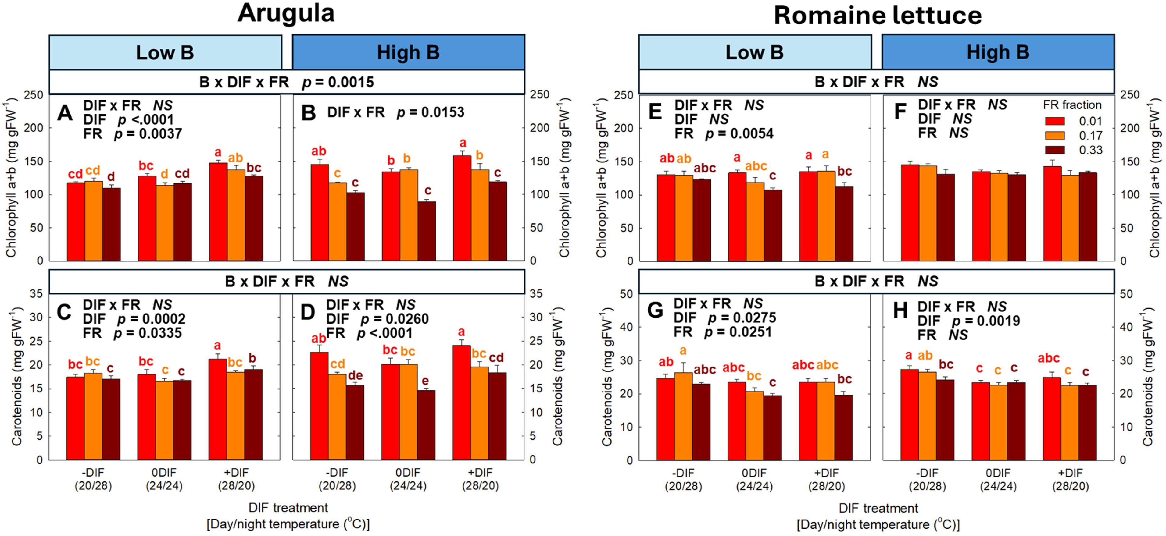 Figure 5. The interactive effect between light spectral quality [0.01, 0.17, and 0.33 of far-red (FR) fraction] and temperature [-DIF (difference between day and night temperature), 0DIF, +DIF] on chlorophyll a+b (A, B) and carotenoids (C, D) of arugula and chlorophyll a+b (E, F) and carotenoids (G, H) of romaine lettuce under low and high blue light conditions. Three-way ANOVA was conducted to assess the interactive effects among FR fraction, DIF, and blue light. To further evaluate the interactions between FR light and DIF under different blue light intensities, two-way ANOVA was performed for FR fraction and DIF within each blue light level. Different letters above the mean ± SE (n = 3 in the third replicate) indicate significant difference among the nine treatments (three FR fractions x three DIF treatments) at p < 0.05. NS stands for non-significance.