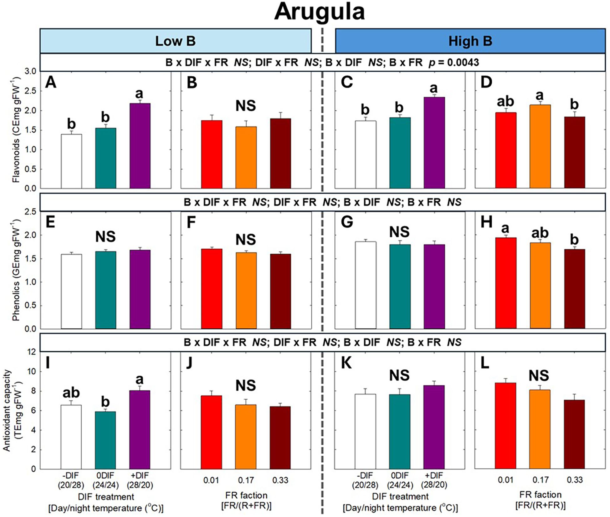 Bar charts detailing the flavonoid, phenolic, and antioxidant capacity levels in arugula under different blue light (B) conditions. Panels A to L compare various DIF treatments and FR fractions. Significant differences are marked by letters a, b, and NS for non-significant results. The study examines low and high B conditions, highlighting specific interactions and p-values.