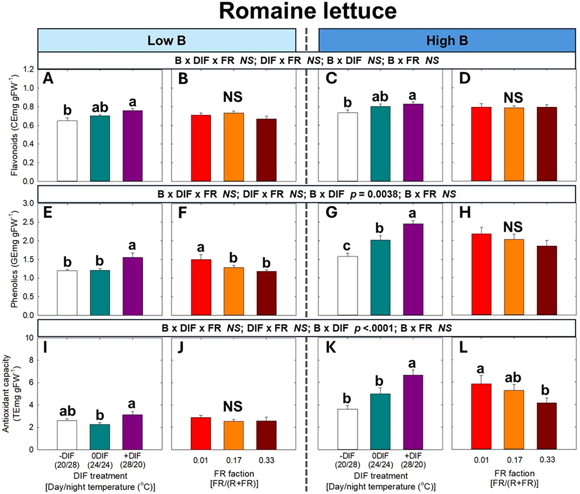 Bar graphs depict the effects of different treatments on flavonoids, phenolics, and antioxidant capacity in romaine lettuce under low and high B conditions. Panels A-D show flavonoid levels, E-H show phenolic levels, and I-L show antioxidant capacity. Treatments include varying DIF treatments and FR fractions. Statistical significance is noted above bars where applicable.