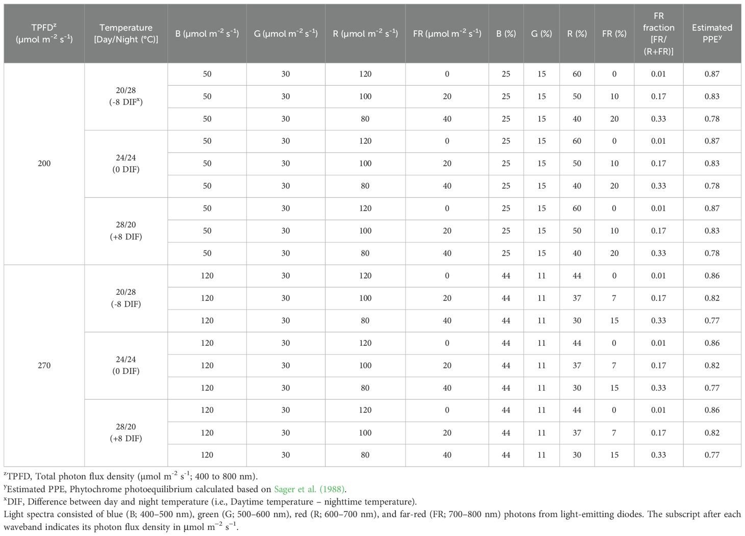 Table 1. Temperature, light spectral characteristics, and photon flux density used.