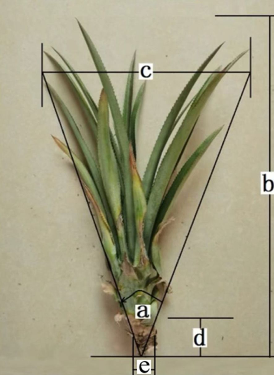 Figure 1. Physical characteristics of large pineapple seedlings. (a) represents the cone angle of the plant type, (b) represents the plant length, (c) represents the plant diameter, (d) represents the root length, and (e) represents the root diameter.