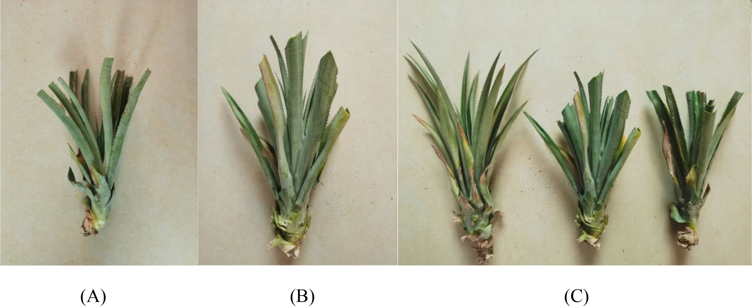 Figure 2. Illustrations of Pruning large pineapple seedlings. (A) Horizontal trimming effect. (B) 45° trimming effect. (C) Trimming effect comparison chart.