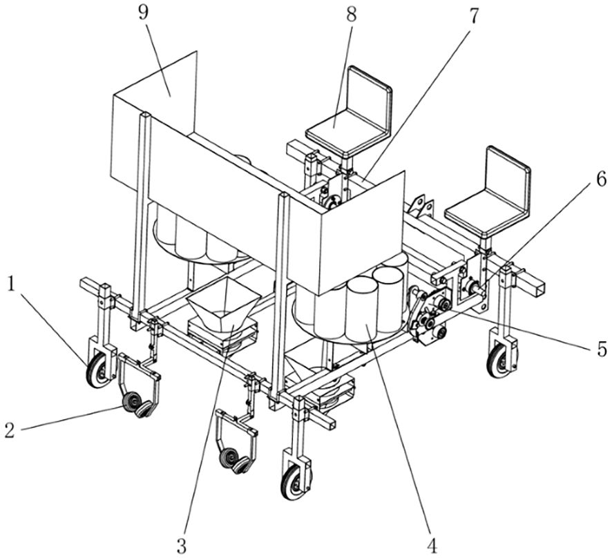Figure 3. Overall structure of pineapple seedling transplanter. 1. Seed box; 2. Seat; 3. Frame; 4. Drive shaft; 5. Transplanting arm mechanism; 6. Seed cup;7. Seed guiding funnel and duckbill planting device; 8. Soil covering and pressing wheel; 9. Guidance wheel.