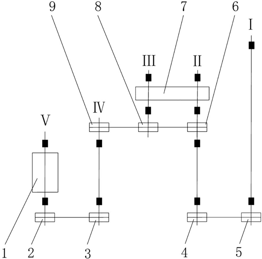 Figure 5. Transplanter transmission mechanism diagram. 1. Seed cup; 2. Sprocket Z5; 3. Sprocket Z4; 4. Transplanting arm;5. Sprocket Z3; 6. Sprocket Z1; 7. Sprocket Z2; 8. Sprocket Z6; 9. Sprocket Z7.. The Roman numerals are explanatory notes for the components.