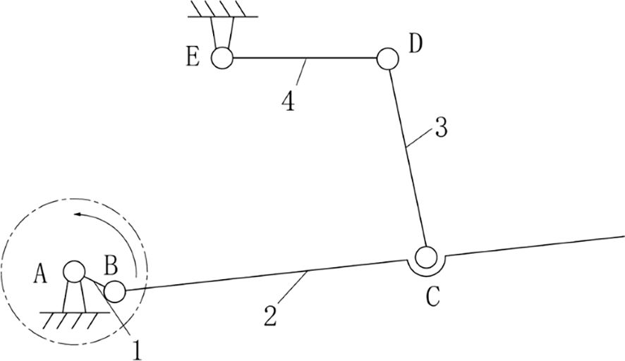Based on the above content and in combination with the transmission mechanism and chain drive design, this paper has designed a connecting rod planting mechanism, integrating and simplifying the two functions of the planting device’s up-and-down movement in the pineapple seedling transplanting machine. This enables the duckbill planting device in the transplanting machine to complete the planting trajectory and posture on the film, improving the uprightness of the pineapple seedlings, achieving stable planting depth, without damaging the seedlings, and increasing the survival rate of the seedlings, ensuring that the pineapple seedlings are accurately transplanted to the field at the prescribed row spacing and plant spacing (Jin et al., 2016; Huang, 2016; Yang, 2019). The kinematic sketch is shown in Figure 6.