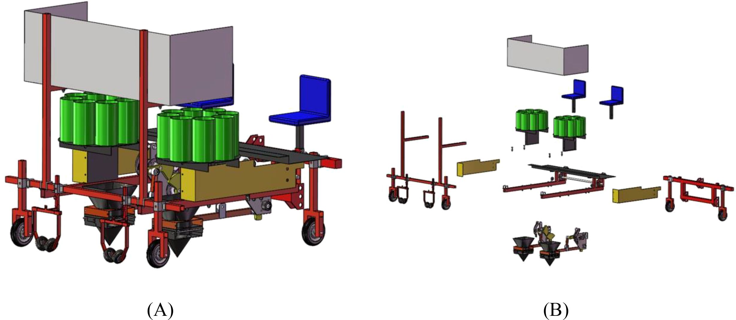 Figure 7. Three-dimensional modeling of pineapple seedling transplanting machine. (A) Assembly simulation diagram. (B) Simulated explosion pattern.