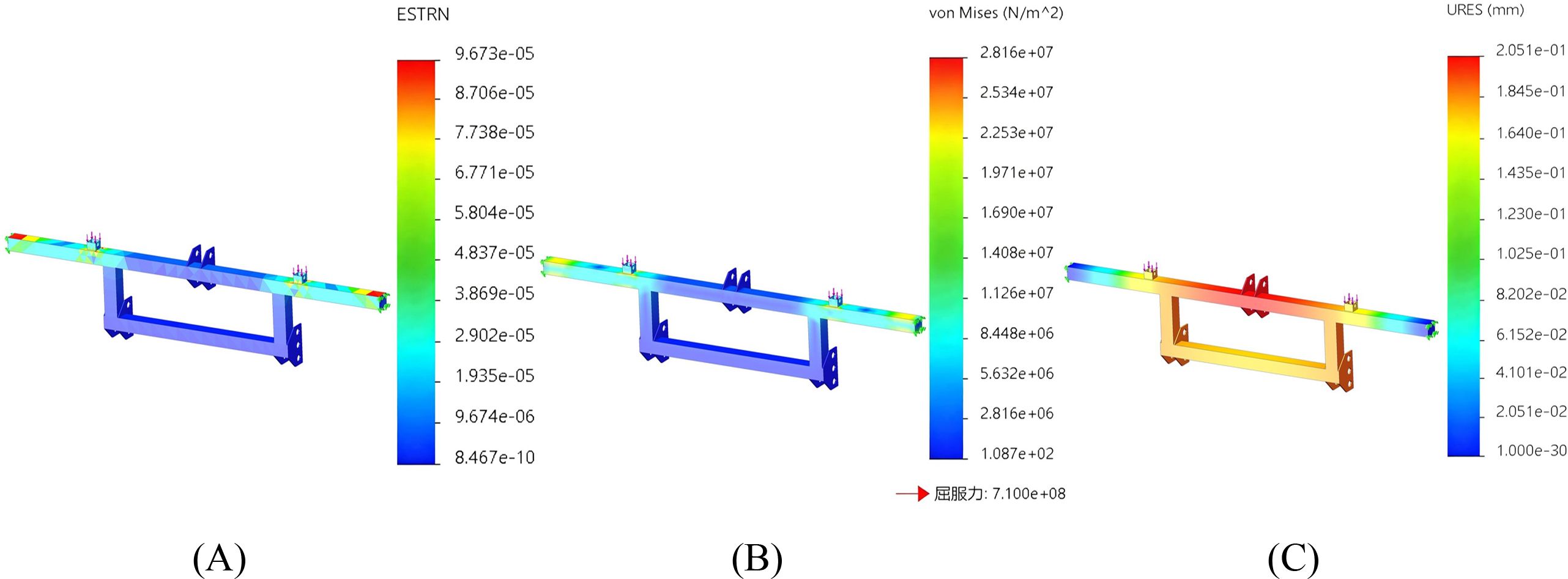 Figure 8. Finite element analysis of the rack. (A) Finite element analysis strain figure of the rack. (B) Finite element analysis stress diagram of the rack. (C) Finite element analysis displacement diagram of the rack.