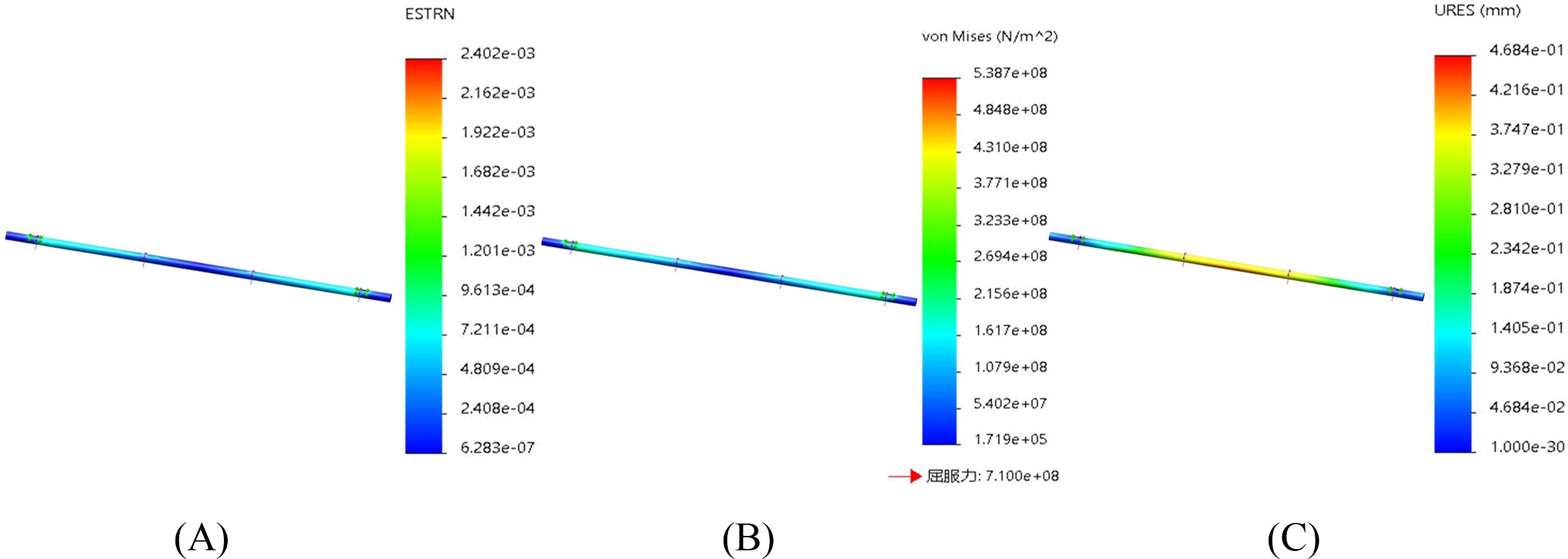 Figure 9. Finite element analysis of the driving shaft. (A) Finite element analysis strain figure of the driving shaft. (B) Finite element analysis stress diagram of the driving shaft. (C) Finite element analysis displacement diagram of the driving shaft.