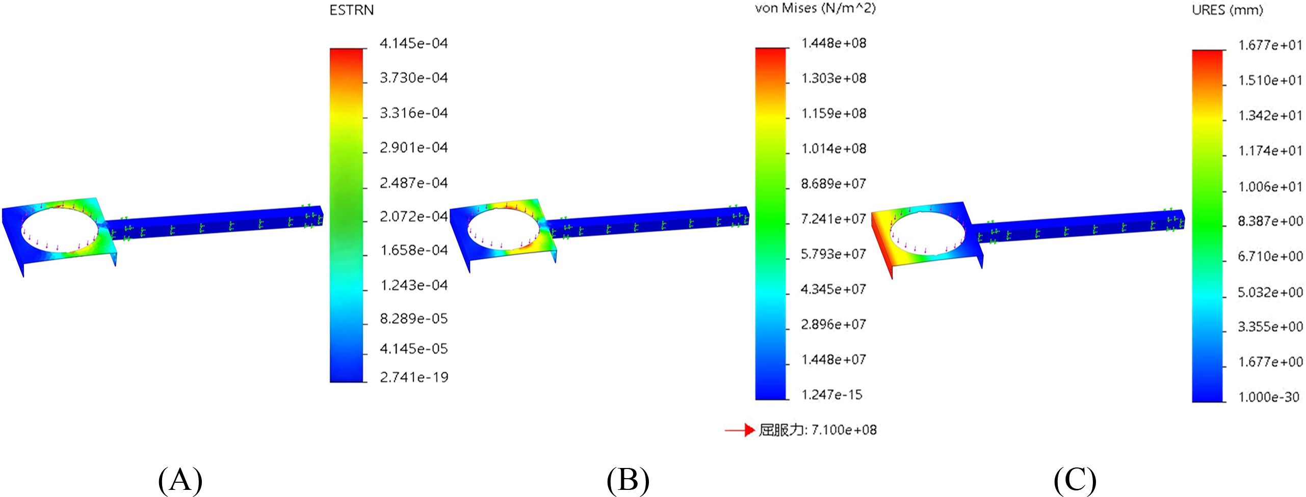 Figure 10. Finite element analysis of the transplanting arm. (A) Finite element analysis strain figure of the transplanting arm. (B) Finite element analysis stress diagram of the transplanting arm. (C) Finite element analysis displacement diagram of the transplanting arm.