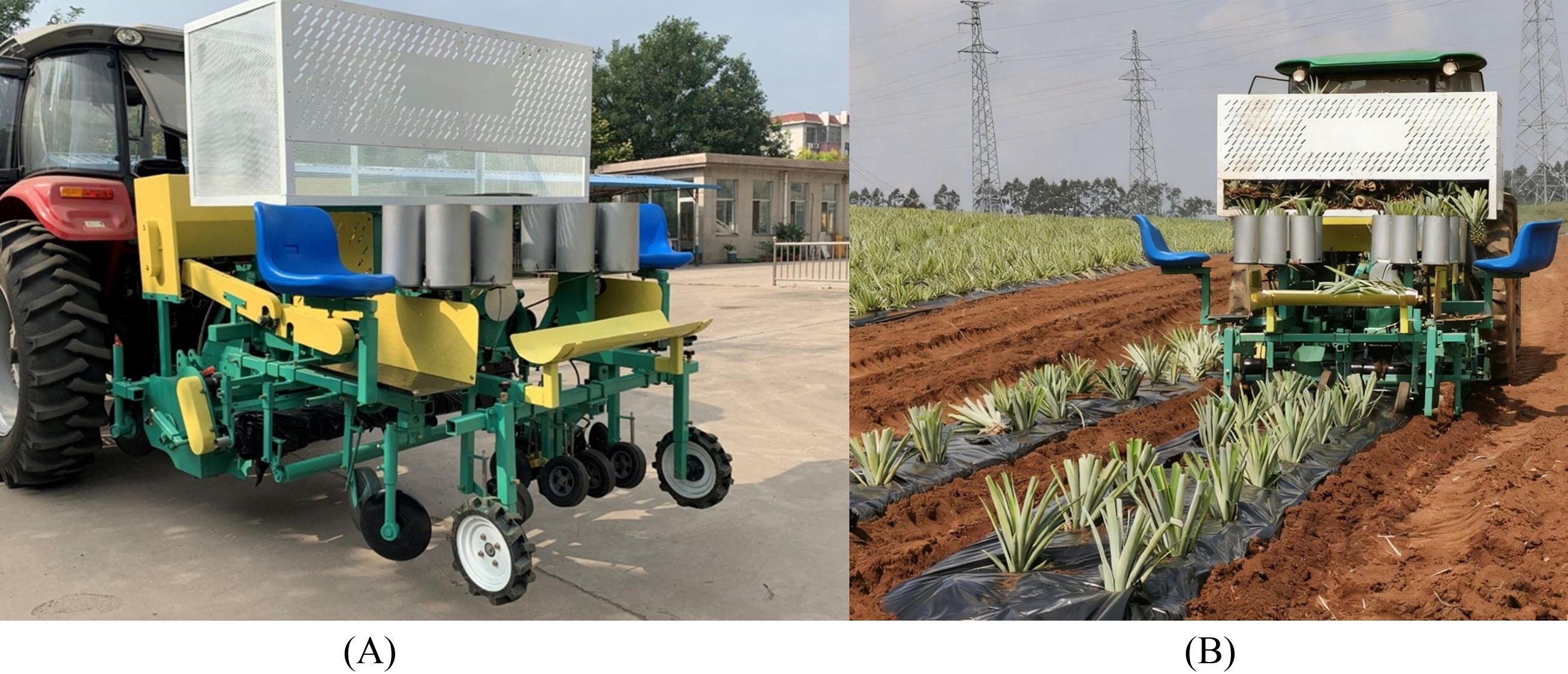 Figure 11. Field test of the pineapple seedling transplanting machine. (A) Prototype drawing of pineapple seedling transplanting machine. (B) Pineapple seedling transplanting machine transplants pineapple seedlings.
