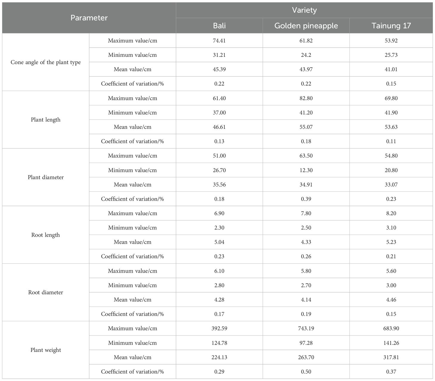 Statistical analysis was conducted on the morphological data of the measurements, as shown in Table 1. It can be observed that there are significant differences among different varieties of pineapple seedlings. The length ranges from 37.00 to 82.80 cm, and the diameter ranges from 12.30 to 63.50 cm.