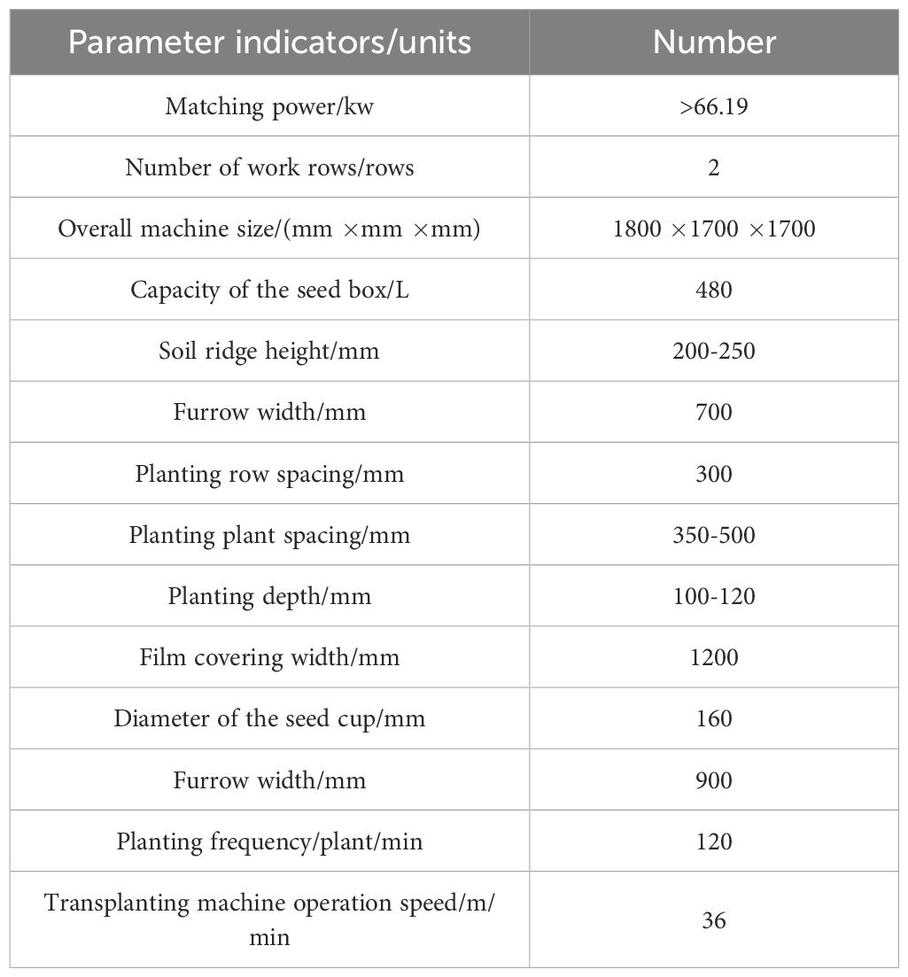 The pineapple seedling transplanting machine is designed for double-row transplanting. The main design parameters are shown in Table 2. The designed pineapple seedling transplanting machine is applicable to farms, professional households and individual farmers. Its total length is 1.8m, width is 1.7m, height is 1.7m, and total weight is 800kg. Therefore, a tractor with a power of 66.19kW or above is selected as the traction power.