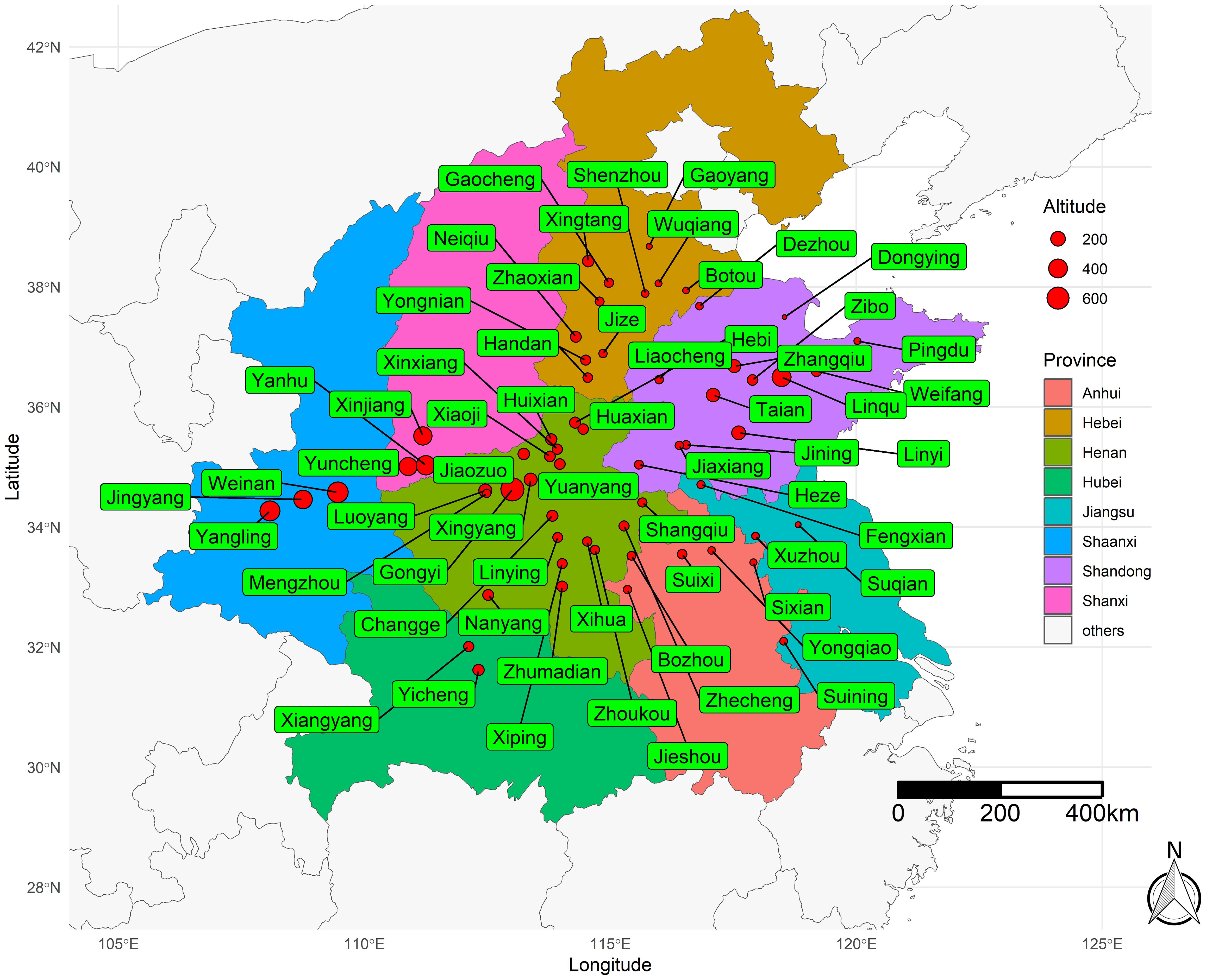 This study was conducted in the major maize-producing area of mainland China — the Huang-Huai-Hai (HHH) Plain (Figure 1). This region encompasses Shandong, Henan, southern Hebei, southern Shanxi, Guanzhong, and southern Shaanxi, as well as northern Jiangsu and northern Anhui, representing approximately 31.86% of the total national maize cultivation area (Yue et al., 2022).