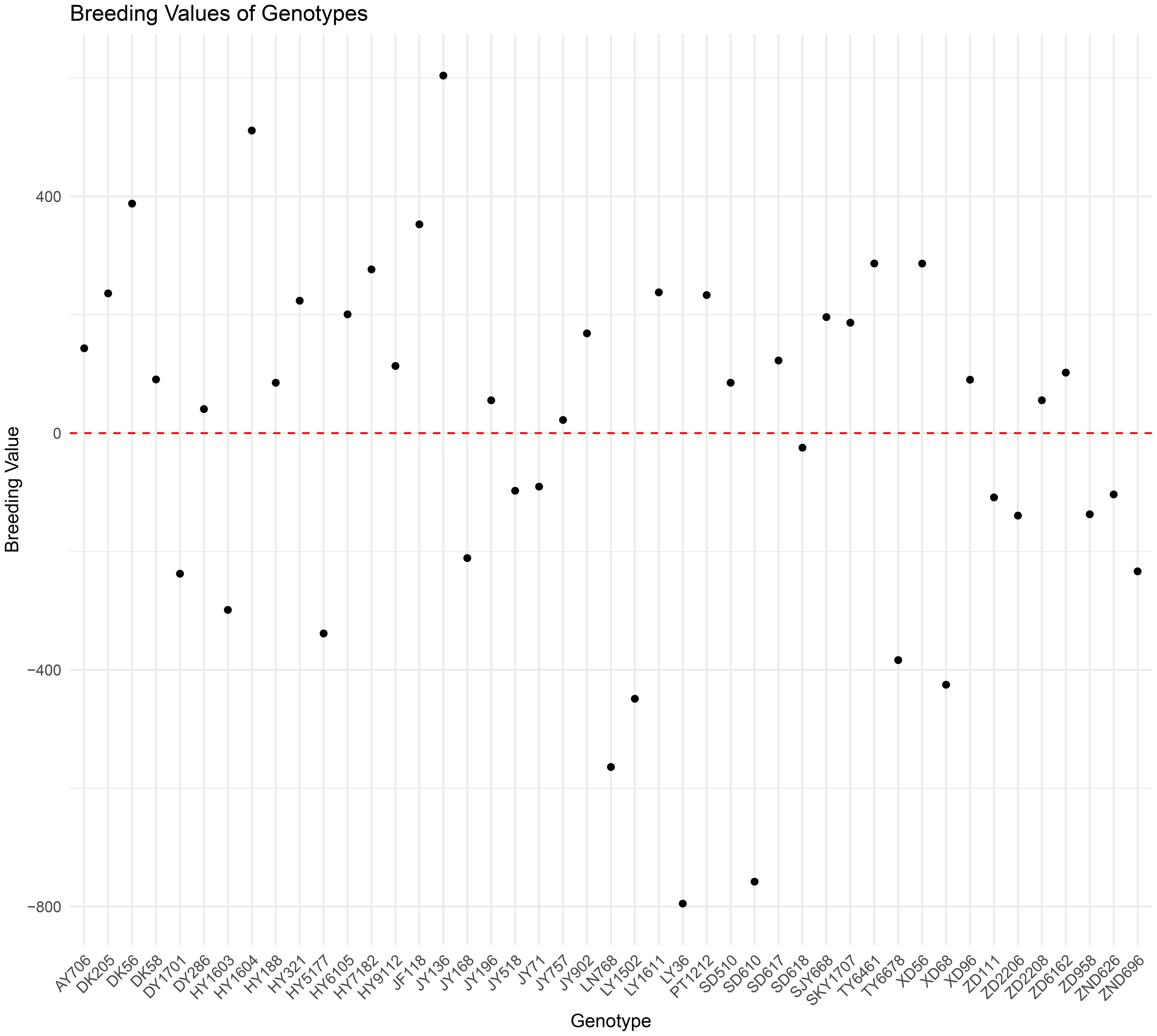 The best linear unbiased prediction (BLUP) is a widely recognized method for estimating the random effects within a mixed linear model. Originally developed for animal breeding to evaluate breeding values, this technique has since been extensively applied in plant breeding and genotype evaluation (Piepho et al., 2008). In this study, the breeding values obtained for various maize hybrids were used to construct a model for forecasting maize yields. Using multilocation trial data collected from maize hybrids in the HHH region between 2016 and 2019, the breeding value for each hybrid was computed using the lmer function from the lme4 package in R software (Bates et al., 2015). The breeding values for each maize hybrid were shown in the form of a scatter plot (Figure 3).