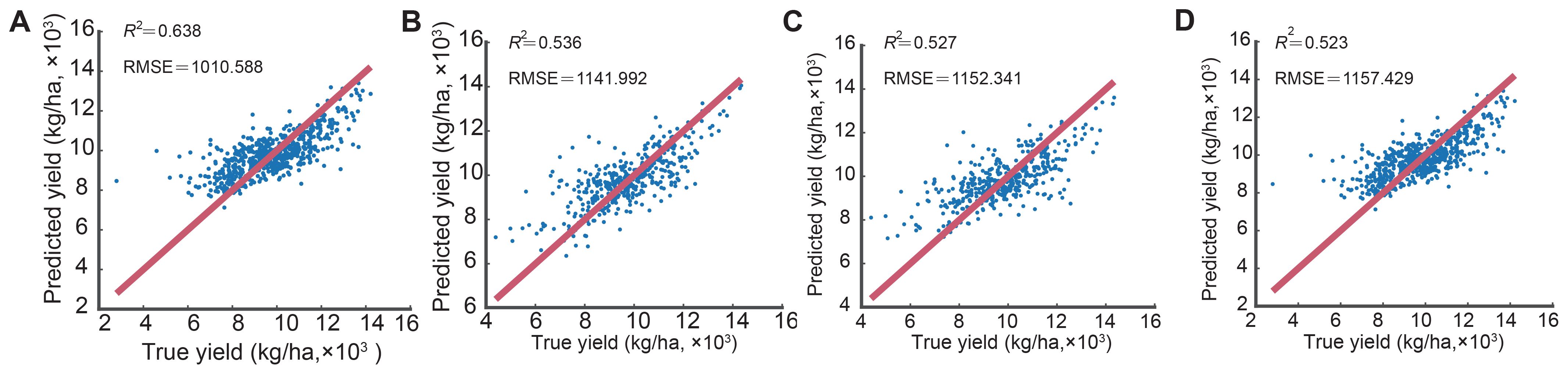 Figure 4. Comparison between observed and predicted maize yields for the four machine learning models: (A) RF, (B) XGBoost, (C) SVR, and (D) GPR.