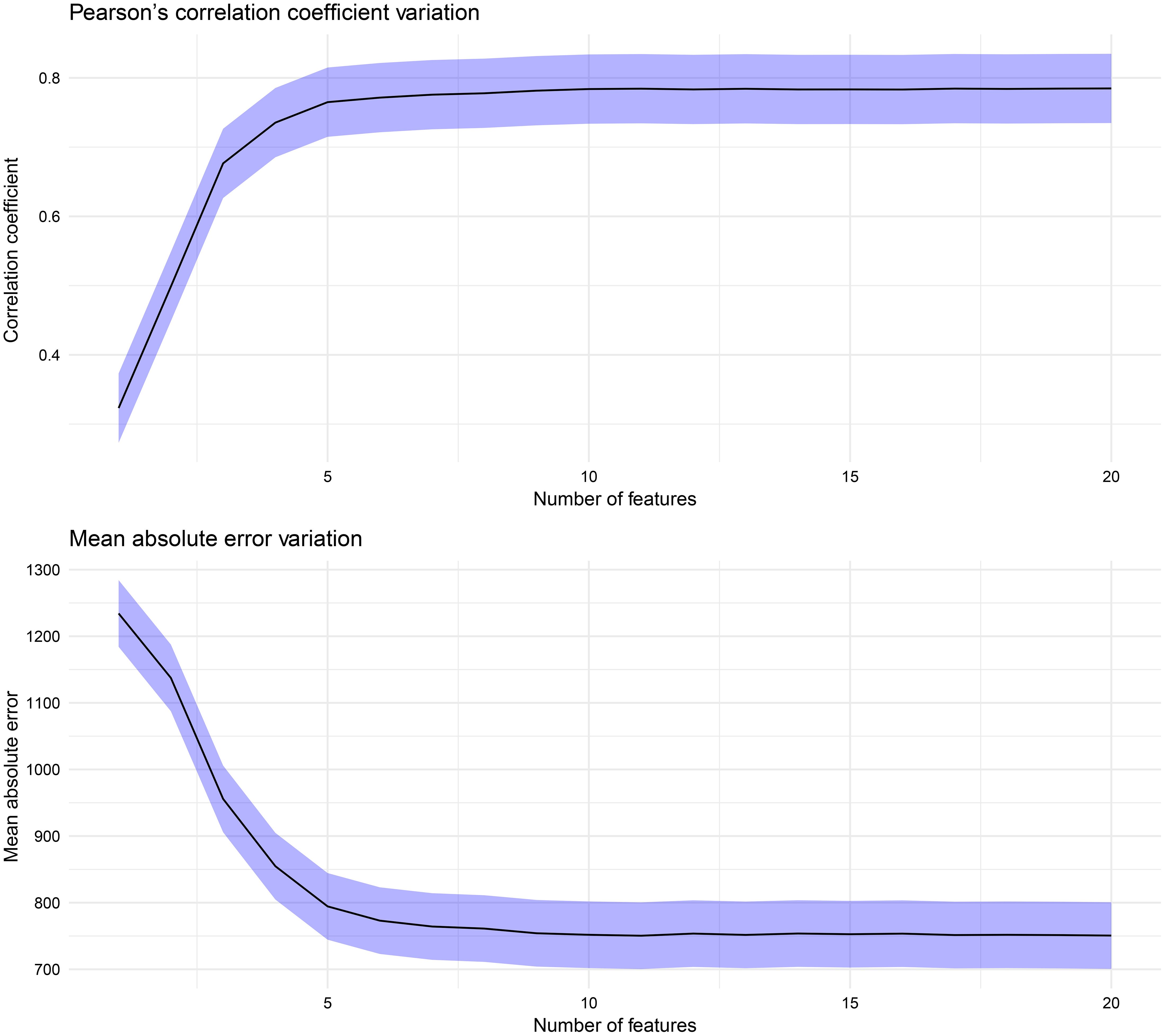 Before delving into the specifics of the performance of our machine learning models, it is important to understand the variations in the predictive accuracy as the number of features in the dataset increases. Figure 6 shows the variations in the correlation coefficient (r) and mean absolute error (MAE) as the feature set size changes, one feature at a time, according to the ranking presented in Figure 4. The increases in r and decreases in the MAE are not uniform; instead, a notable peak occurs with the top five features: the breeding value, ASKLW, n, PETP, and ETP. When the random forest (RF) model utilizes these five features for forecasting maize yield, it achieves an explanatory power of over 75% (with an MAE of approximately 800 kg ha−1). In contrast, the model’s predictive performance decreases to approximately 50% (with an MAE exceeding 1000 kg ha−1) if the features n, PETP, and ETP are excluded.