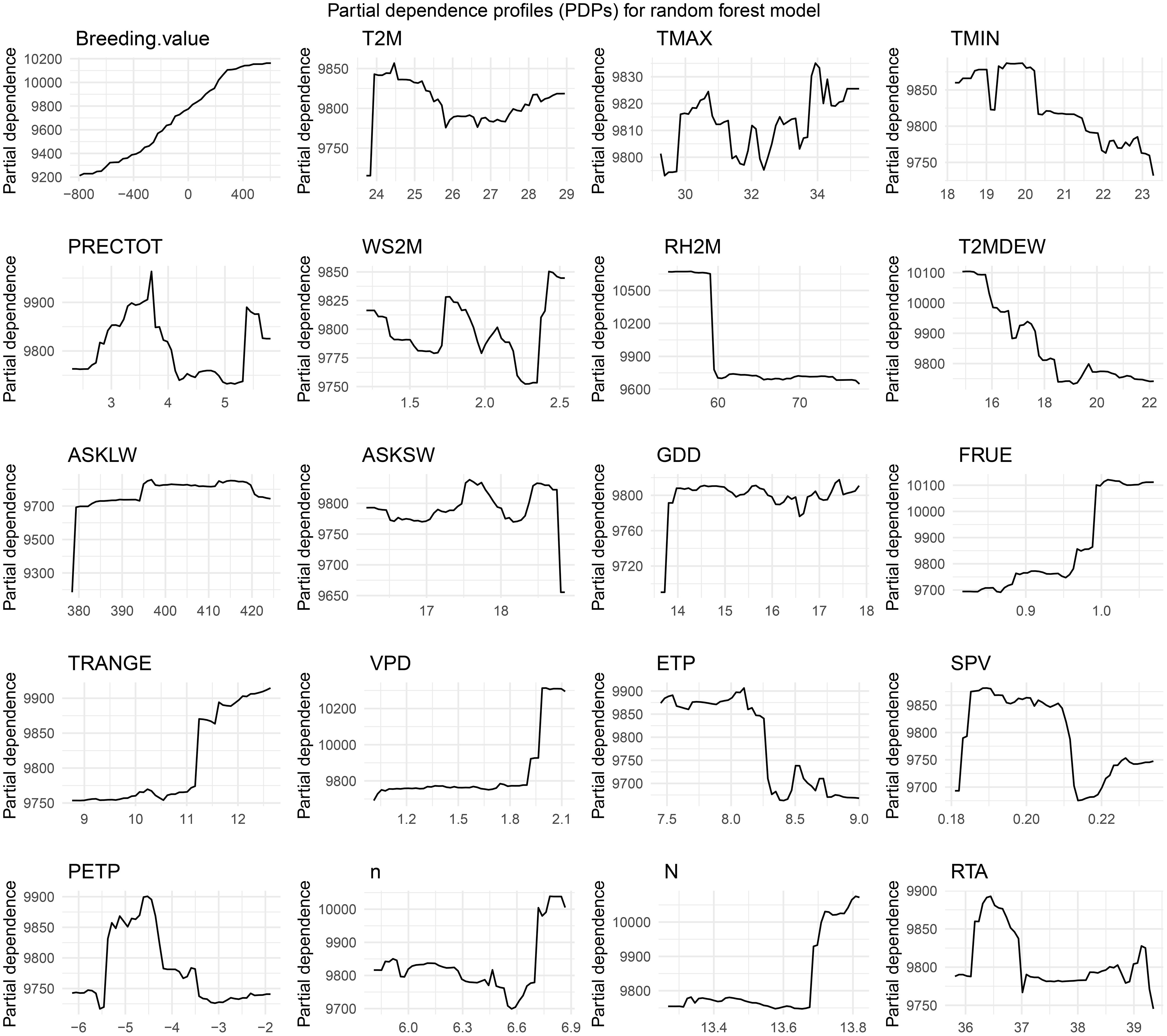 We explore the partial dependence profiles (PDPs) of various features included in our random forest model. These plots provide valuable insights into how each feature influences the model's predictions, with other variables held constant. By analysing the shape and trends of these curves, we can identify the most influential variables and their relationships with the predicted yield. This analysis helps to highlight key features that contribute significantly to the model’s performance, and guide further feature engineering or refinement of the model (Figure 7). According to the PDP results, an increase in breeding value leads to a higher predicted yield for maize hybrids. However, when the daily average temperature (T2M) exceeds 24.5°C d−1, the maximum temperature (TMAX) exceeds 31°C d-1, the minimum temperature (TMIN) exceeds 19°C d-1, and the dew point temperature (T2MDEW) exceeds 16°C, the yield decreases. A relative humidity (RH) greater than 60%, downwards thermal infrared (longwave) radiative flux (ASKLW) greater than 380 MJ MJ m−2 d−1, all-sky insolation incident on a horizontal surface (ASKSW) below 19 MJ m−2 d−1, and growing degree days (GDD) exceeding 14°C d−1 have minimal impacts on yield. Conversely, rainfall precipitation (PRECTOT) above 5 mm and a wind speed at 2 m above the surface of the earth (WS2M) above 2.25 m/s result in yield reduction. As a short-day plant, maize has little variation in yield when the daily photoperiod is shorter than 13.6 hours. Extraterrestrial radiation (RTA) above 37 MJ m−2 d−1 also has a negligible effect on yield variation. In contrast, vapor pressure deficit (VPD) below 2.0 kPa d−1 and saturation vapor pressure (SPV) below 0.19 kPa d−1 both contribute to an increase in yield.