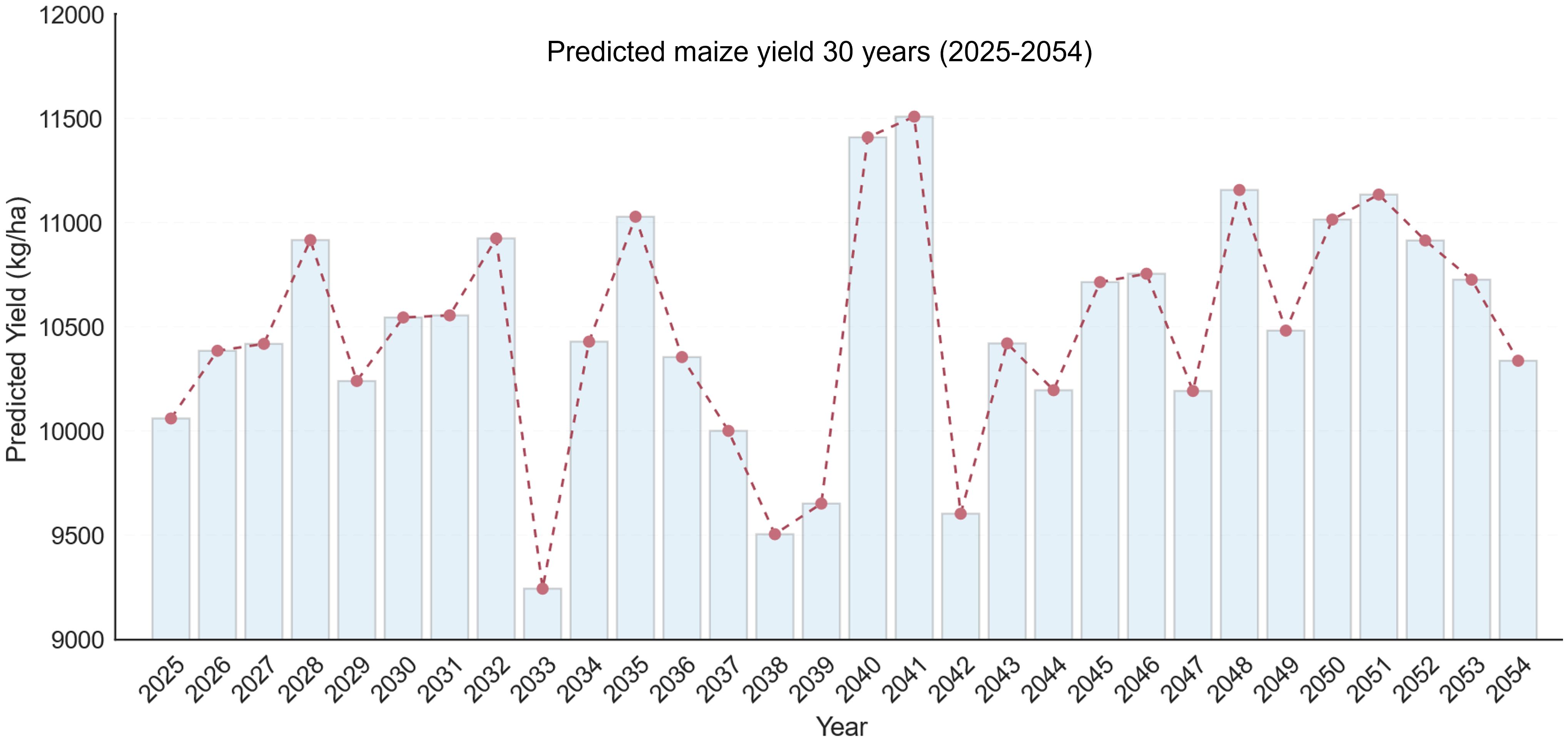 5. Future Yield Prediction: The best-performing model was then used to predict future maize yields for the next 30 years (2025–2054). These predictions are visualized as a time series graph, providing a forecast of maize yield trends over the coming decades, taking into account the environmental variables and their predicted changes.