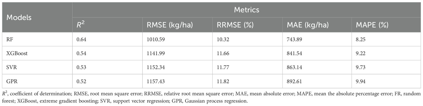 Results: Among these models, the RF algorithm achieved the best performance, with a coefficient of determination (R²) of 0.64, a root mean square error (RMSE) of 1010.59 kg/ha, a mean absolute error (MAE) of 743.89 kg/ha, a relative RMSE (RRMSE) of 10.32%, and a mean absolute percentage error (MAPE) of 8.3%.