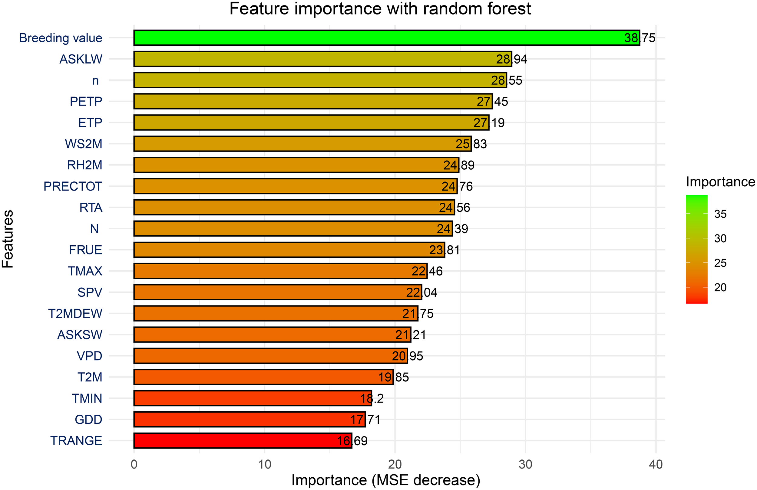 To explore which environmental factors have the greatest impact on the model's regression prediction ability, we used MSE decrease to visualize the importance of these environmental factors in this study. As shown in Figure 5, key predictors influencing maize yields within the RF model can be identified through variable importance analysis. These predictors are assessed using the "percentage increase in the mean square error" (MSE%) metric, where a greater increase in MSE% signifies a more influential variable. The findings revealed that breeding value stands out as the most critical factor affecting maize yields. This breeding value reflects the combined effect of genes, which significantly impacts yield determination. Among the meteorological variables, downwards longwave radiation flux (ASKLW), sunshine duration (n), precipitation deficit (PETP), and potential evapotranspiration (ETP) were identified as the most significant contributors to maize yields, followed by and surface-level wind speed (WS2M). In contrast, the temperature range (TRANGE) had the smallest effect on yield predictions among all the variables.