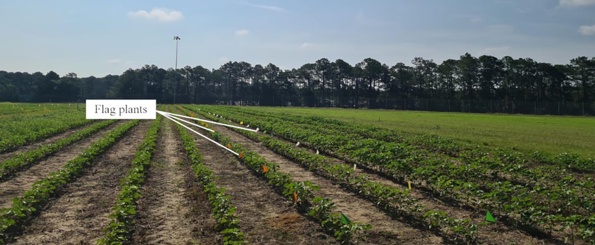 At the start of the season, right after plant emergence, eight cotton plants were selected for the data collection in each monitored plot. Each plant was individually marked with a plastic field flag, positioned next to the plant to avoid contact with the main stem (Figure 2). These flags remained in place throughout the study, allowing for accurate identification of the monitored plants on each data collection date. On each scheduled measurement date, the number of nodes, height, and the fourth internode length of the marked plants were recorded. The height of the plant and the length of the fourth internode were measured using a ruler, and the readings were taken to the nearest 0.64 cm. The measurements were taken twice a week from June 5 to August 22, covering all critical stages of cotton growth.