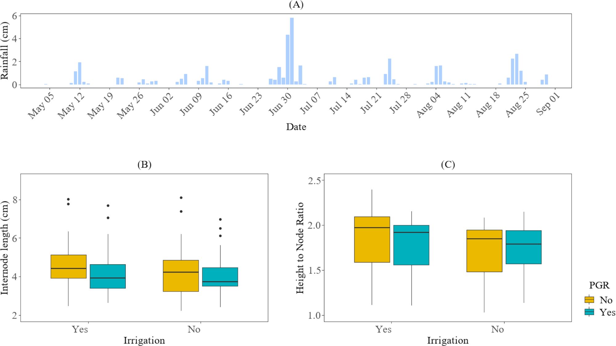 Figure 4. The impact of irrigation and PGR application on cotton growth in the 2025 season at HortHill farm. (A) illustrates the amount of rainfall received at HortHill from May to August 2025. (B) depicts the effect of PGR and Irrigation on the variation of the fourth internode length, with the measurement pooled across all sampling dates to summarize the season distribution of this trait. (C) demonstrates the corresponding effect of PGR and Irrigation on the growth variation for the cotton plant height-to-node ratio, also based on data aggregated across the entire monitoring period to summarize its seasonal distribution.