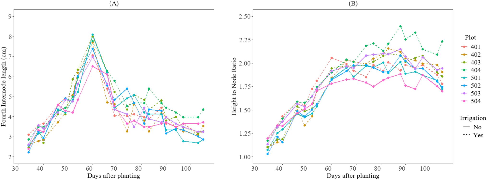 Furthermore, as illustrated in Figure 5, although there was no significant difference in growth between treatments, plots under irrigated conditions reached approximately 5 cm in the fourth internode length approximately 52 days after planting. In contrast, the non-irrigated plots reached the same internode length 54 days after planting. Additionally, internode elongation in both fields reached its peak length around 60 days after planting (DAP). For the height-to-node ratio, the irrigated plots reached 1.3 at 38 DAP and 1.9 at 60 DAP, while non-irrigated plots reached 1.3 at 40 DAP and 1.9 at 80 DAP.