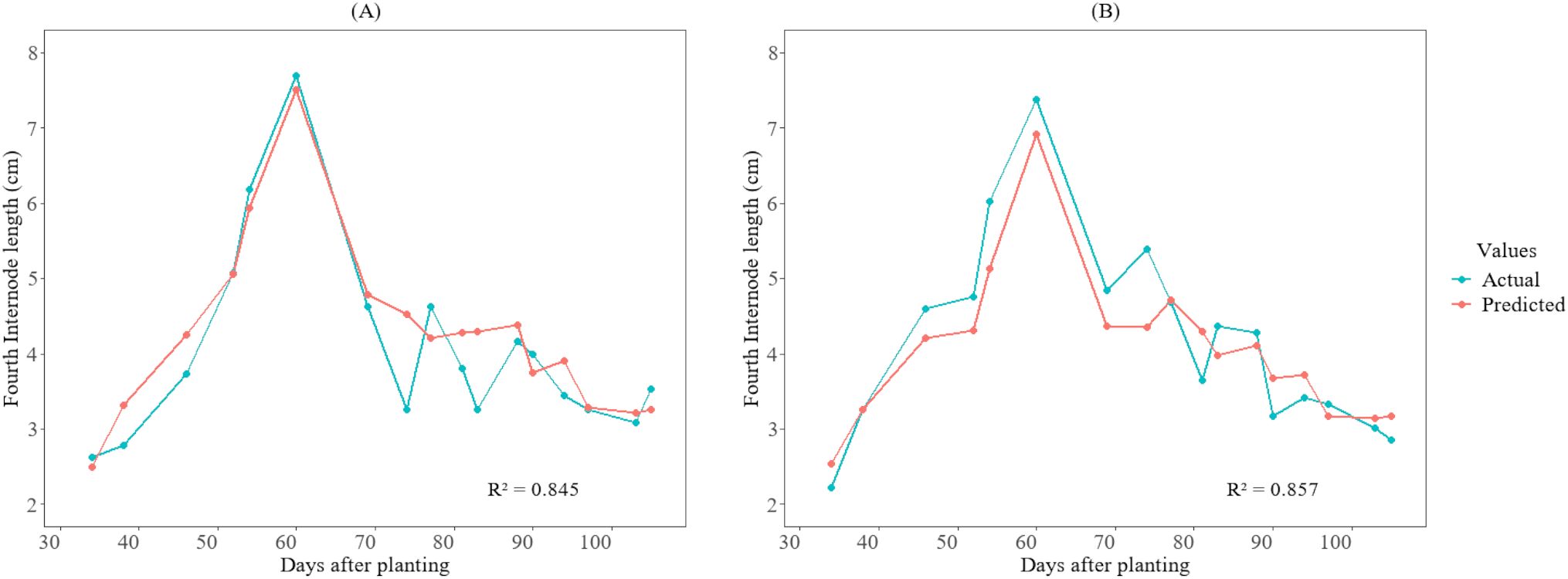 Figure 6. Growth variations of the fourth internode length between actual and predicted values for the cotton crops in the 2025 season at HortHill farm. (A) illustrates the actual vs predicted fourth internode length for plot 402, and (B) shows the actual vs predicted fourth internode length for plot 502.