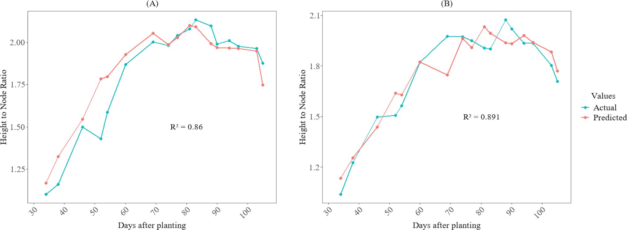 Figure 7. Growth variations of the height-to-node ratio between actual and predicted values for cotton crops in the 2025 season at HortHill farm. (A) illustrates the actual vs predicted height-to-node ratio for plot 402, and (B) shows the actual vs predicted height-to-node ratio for plot 502.
