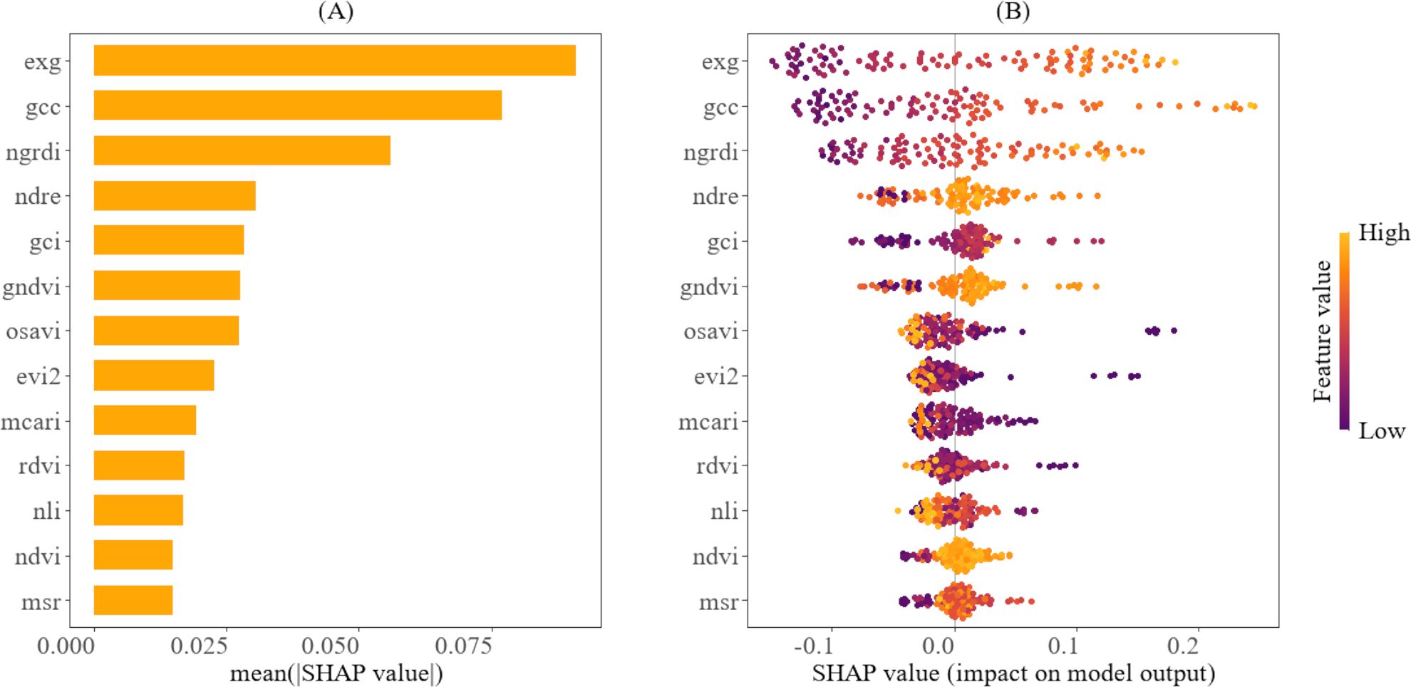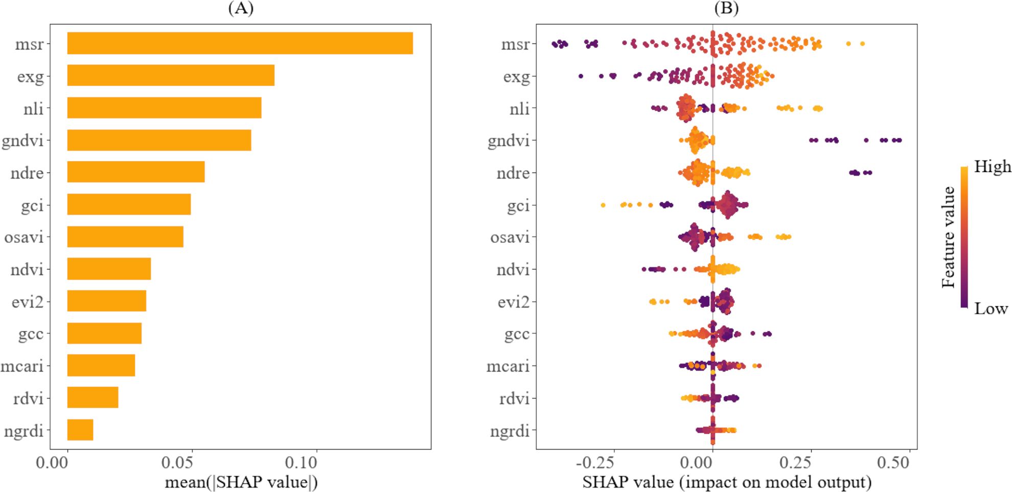 Figure 9. Explainability analysis of the SVR using SHAP for predicting the height-to-node ratio. (A) depicts the variable ranking, indicating the importance of the vegetation indices to the model. (B) illustrates the relative importance of vegetation indices and their impact on model predictions, highlighting how their value distribution influences model predictions.