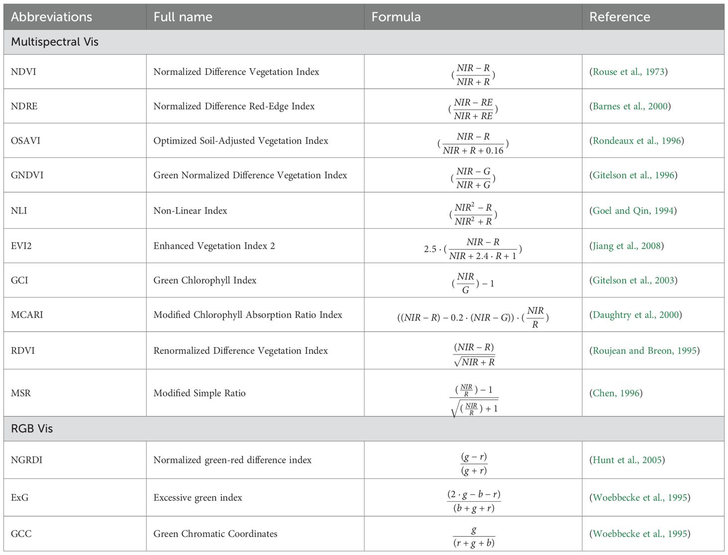 Vegetation indices chosen for this study are listed in Table 1. We selected these indices based on their demonstrated effectiveness in quantifying in-season plant growth parameters (see references in the table). Additionally, they are compatible with the spectral bands accessible on our UAV platform.