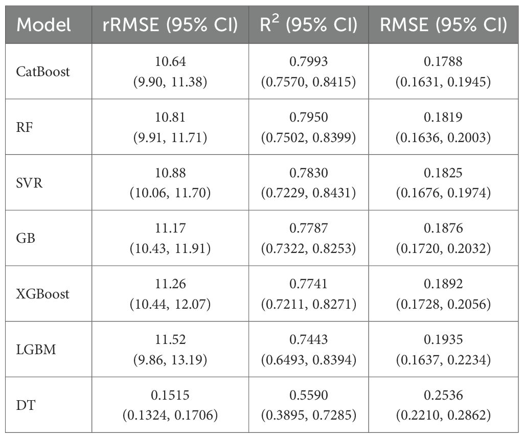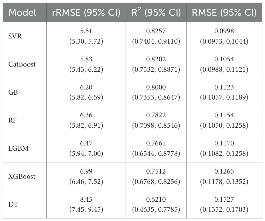 Table 2 presents the cross-validation performance of the SVR, GB, CatBoost, RF, LGBM, XGBoost, and DT for predicting the fourth internode length. The CatBoost algorithm achieved the best performance, with the lowest rRMSE value of 10.64, with a 95% confidence interval (CI) ranging from 9.90 to 11.38. It also achieved the highest coefficient of determination (R2) of 0.799, with a 95% CI of 0.757 to 0.8415. RF and SVR follow closely behind, with rRMSE values of 10.81 and 10.88, and R2 values of 0.795 and 0.783. GB, XGBoost, and LGBM exhibited slightly weaker performance compared to CatBoost, with rRMSE and R2 values ranging from 11.17 to 11.52 and 0.779 to 0.744, respectively. Conversely, DT achieved an rRMSE value of 15.15 and an R² of 0.559, indicating a higher predictive error and limited ability to capture the complex, nonlinear relationship in the data.